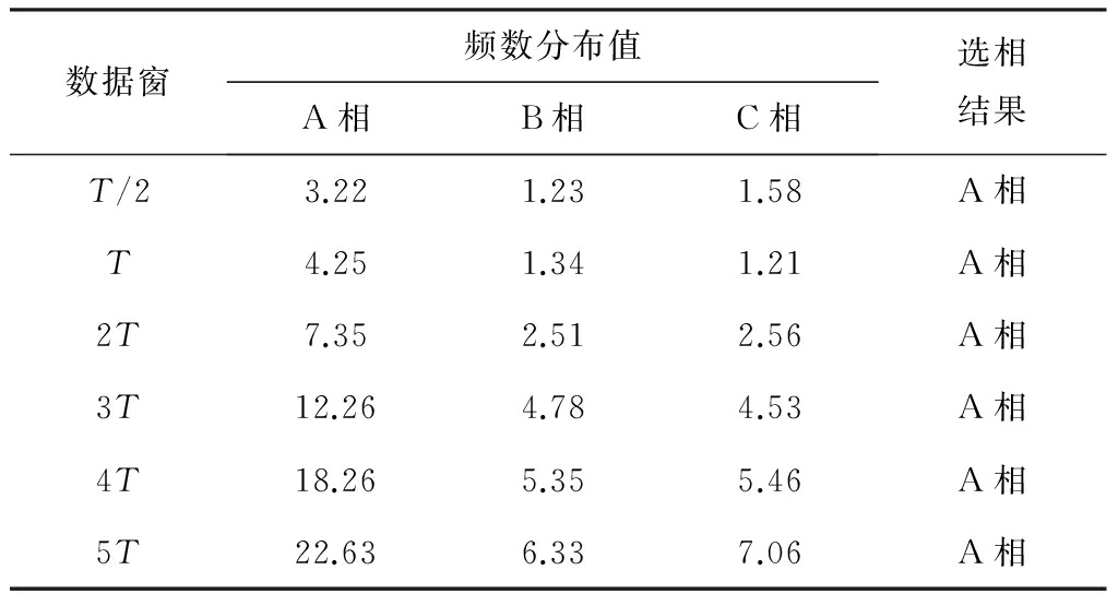 设线路L5的A相距母线2 km处在故障合闸角为25°时,发生接地电阻为500 Ω的单相接地故障。选取不同的数据窗长度进行仿真,仿真结果见表3,其中T为1个工频周期。可见,随着数据窗长度的增加,根据最大频数分布值能准确判定出故障相。为了保证选相的快速性,并且考虑数据窗长度增加带来的存储问题,本文选取1/2工频周期的数据窗。