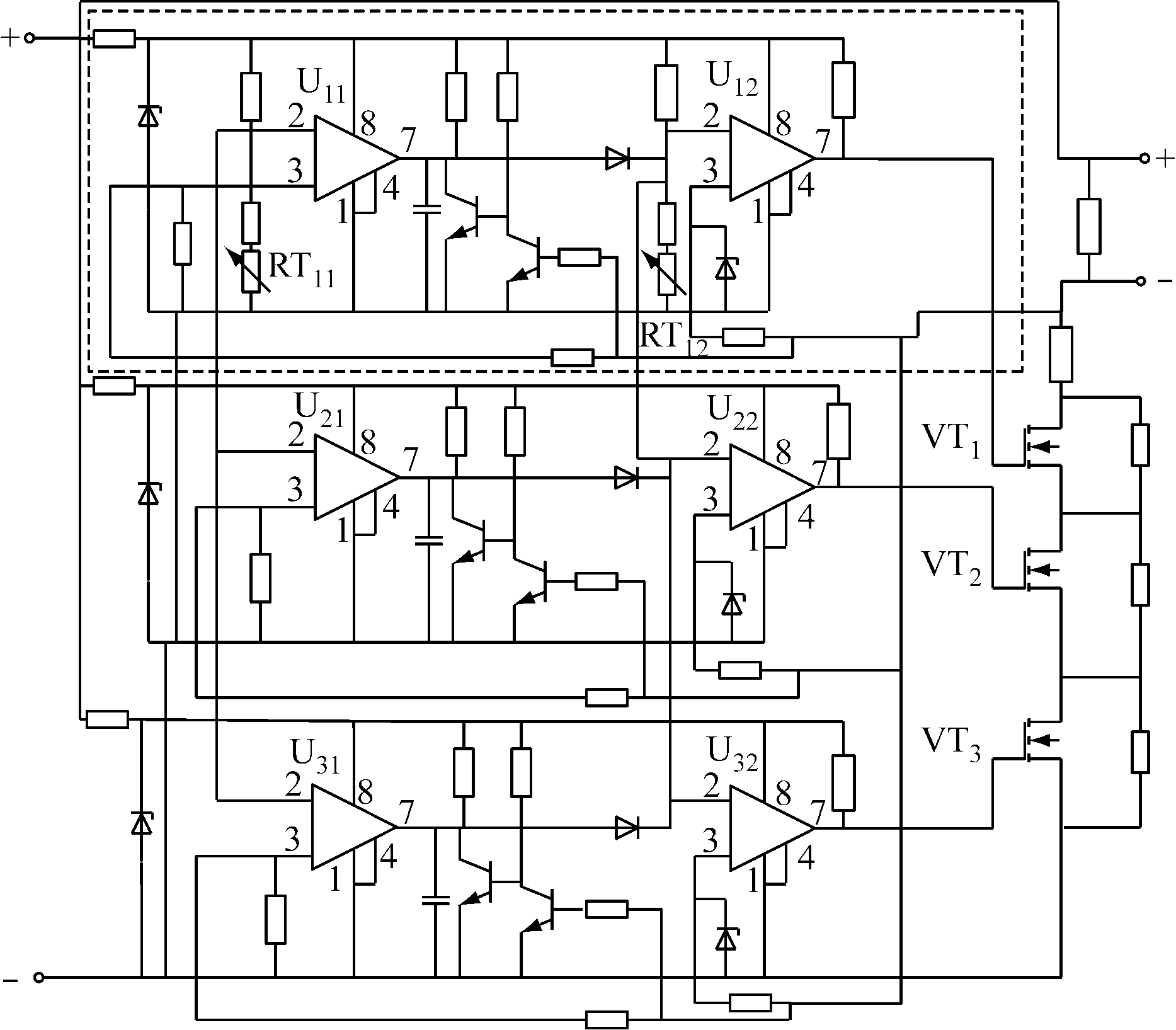 常用的过流保护有限流型和截流型2种类型。本文采用文献[11]中的快速截流保护电路。该电路不含电感元件,只有1个1 μF电容,具有过流关断、自恢复功能,且截止电流大、截流速度快(0.1 μs级)、投入点可调节。由该电路组成的三重过流保护电路如图3所示。开关管VT1,VT2,VT3选用IRF3710S Power MOSFET。三重过流保护电路需要3套驱动检测控制电路,如图3中虚线框内所示。每套驱动检测控制电路分别控制1个开关管,实现电路启动、截流、过流恢复等功能。当其中一重过流保护电路因故障不能正常工作时,其余电路仍能保持独立工作。电路具体参数可参考文献[11],本文不再赘述。