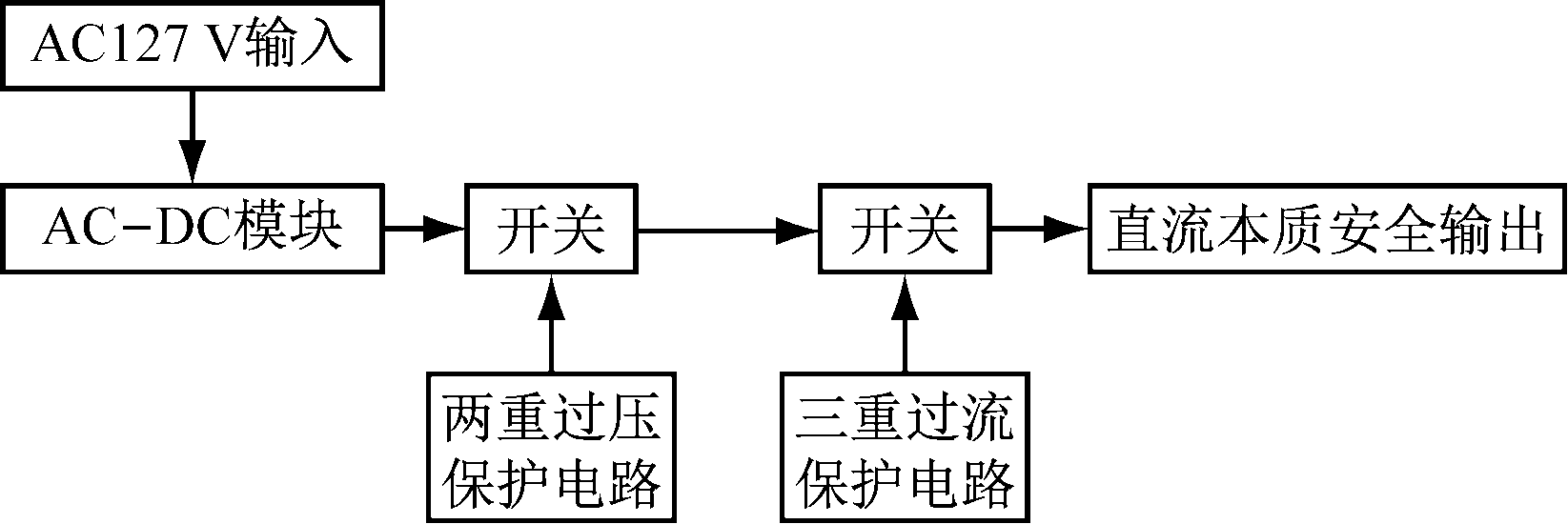 目前专门针对“ia”级本质安全型矿用电源设计的文献较少。文献[2-4]通过限制电源内部电气参数,使其满足本质安全要求。事实上,电源需要较大的整流滤波电容,该部分很难达到完全本质安全要求[5],大部分矿用电源的安全性能主要依靠多重化输出限能来实现[6]。文献[7]设计了一种基于单端反激式矿用电源, 采用隔离变压器实现电气隔离,主电路设计复杂。目前大部分矿用电源都放置在隔爆外壳中,较为笨重。本文设计了一种“ia”级新型本质安全型电源。其采用全封闭式AC-DC模块,在输出端设计符合本质安全要求的两重过压、三重过流保护电路,且不需要专门的隔爆外壳,满足GB 3836.4—2010中“ia”等级对本质安全型电源的要求。
