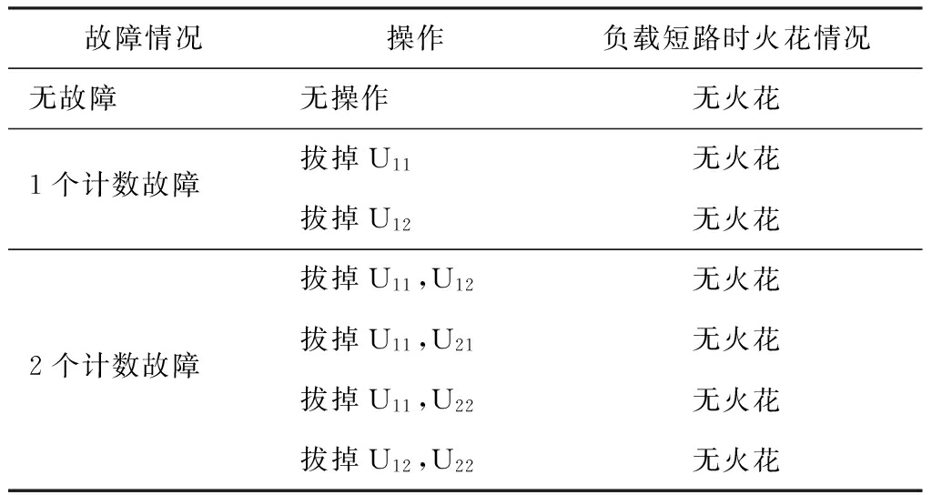 然后对新型本质安全型电源进行故障模拟实验。设置2种计数故障:使开关管一直导通的故障;使开关管一直关断的故障。实验中拔掉比较器U11(U21,U31),会使开关管VT1(VT2,VT3)一直处于关断状态;拔掉比较器U12(U22,U32),会使开关管VT1(VT2,VT3)一直处于导通状态。分别观察电源在无故障、存在1个计数故障、存在2个计数故障时,出现最不利条件非计数故障(即负载短路)情况下负载侧火花放电情况。故障模拟实验结果见表2。