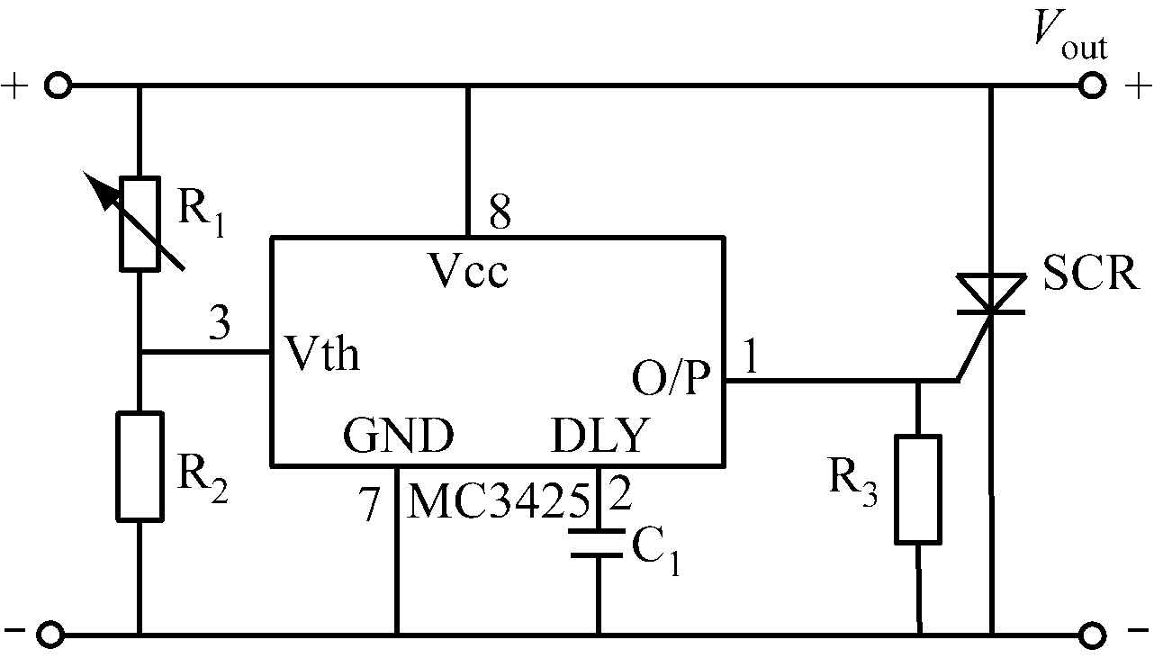 过压快速保护电路如图2所示。其灵敏度高,能实现过压速断,输出端可承受1 A以上电流[10]。该电路动作电压Vmax=12.9 V。根据Vmax=2.5(1+R1/R2),设定R1=10 kΩ,R2=2.4 kΩ。当电压正常时,R1,R2组成的分压器分压小于检测芯片MC3425内部基准电压(2.5 V),MC3425端口1输出低电平,不能触发SCR,电路正常输出12 V;当电压超过规定值时,R2电压大于MC3425内部基准电压,MC3425端口1输出高电平,SCR导通,因其导通电阻很小,输出端电压被短路,造成前面的模块输出关断,从而达到过压保护效果。