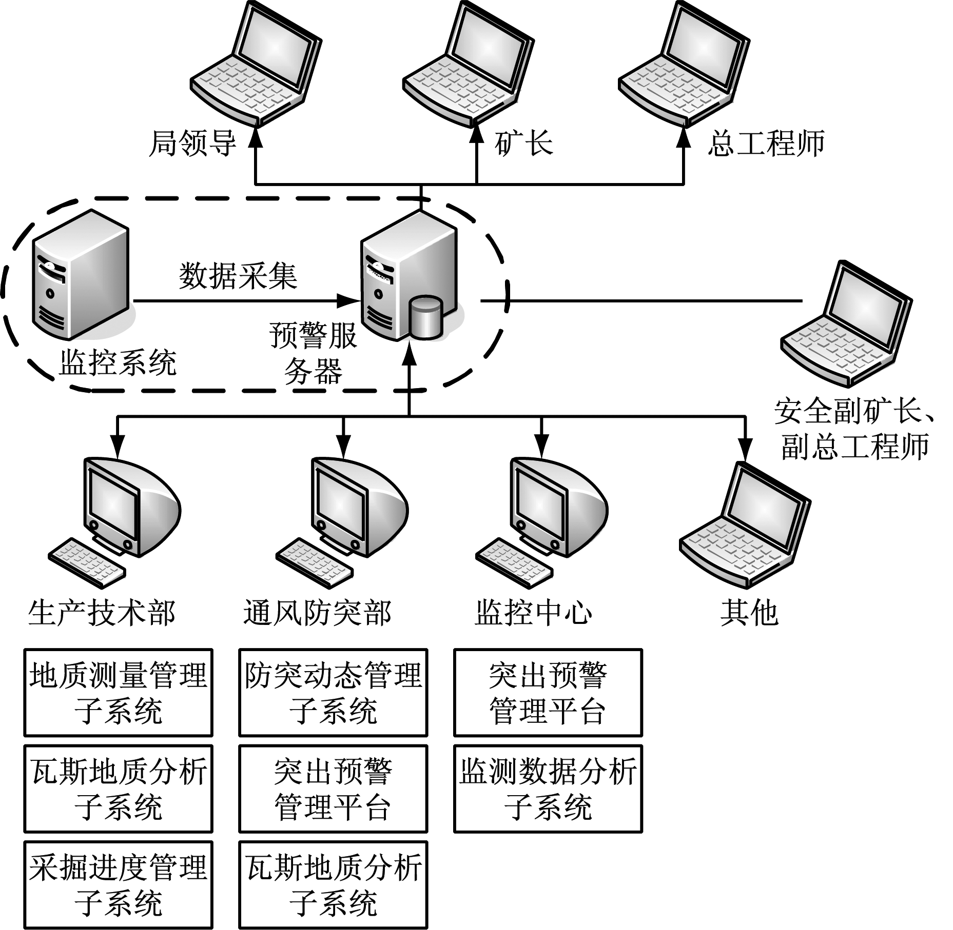 煤与瓦斯突出是煤炭采掘过程中易发生的一种大型动力灾害,其突出能量大,破坏能力强,易导致大规模的人员伤亡,严重影响着煤矿的安全生产和经济效益。中国是煤与瓦斯突出事故最严重的国家之一,突出矿井多、分布广,突出事故多,重特大突出事故时有发生[1-2]。通过大量突出事故调查发现,防突措施落实不到位和防突管理不到位是突出事故发生的主要原因。因此,通过多种途径实现突出危险性、隐患的超前预警和强化防突管理是有效防突的重要手段[3-6]。目前煤与瓦斯突出危险性预测的常用指标主要包括区域预测指标和工作面预测指标,区域预测指标分为单因素指标(瓦斯压力或瓦斯含量)及综合指标(D值和K值)等,工作面预测指标包括钻屑瓦斯解吸指标、钻孔瓦斯涌出初速度和钻屑量指标等。常规的煤与瓦斯突出预测技术是抽检式、不连续、局部的预测,具有相当大的局限性[7-8],某一预测指标只能间接和部分地反映影响突出危险某一因素,没有从大的区域角度提前对瓦斯灾害及严重程度进行提前预警,并建议矿井采取相应的措施。本文设计的煤与瓦斯突出综合预警系统利用智能信息化装备和技术,将灾害预警理论应用于矿井瓦斯灾害防治领域,实现了矿井瓦斯灾害的超前预警[9]。