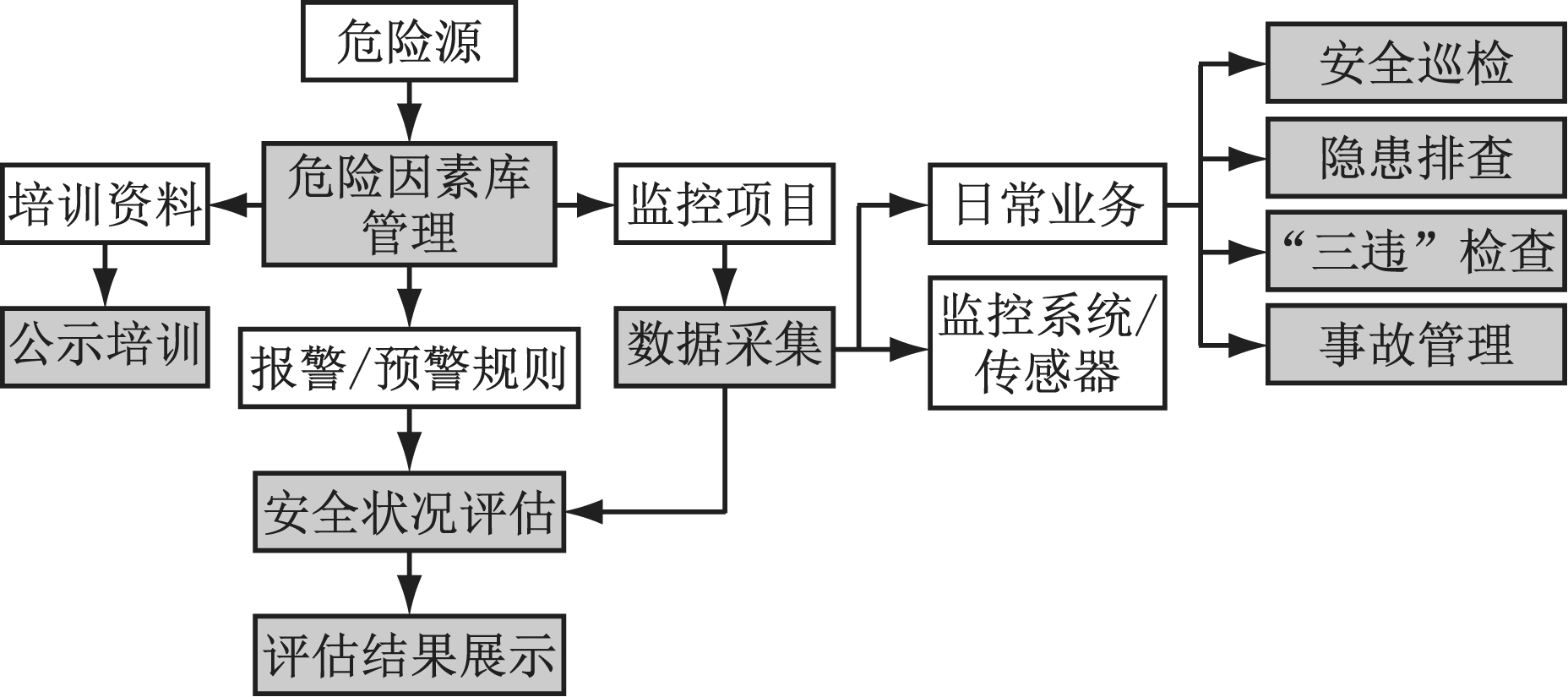 (2) 建立以危险源为核心的安全状况评估及预警模型,评估的数据样本既包括传感器、监控系统监测数据,又包含和危险源相关的安全管理数据。