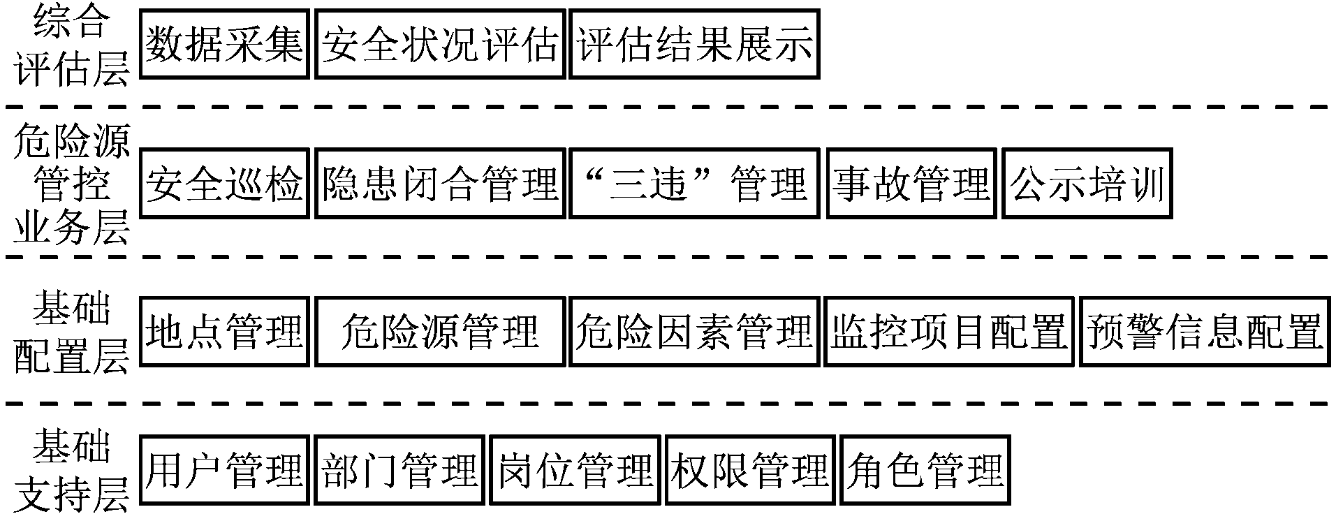 系统主要包括基础支持层、基础配置层、危险源管控业务层、综合评估层,如图1所示。