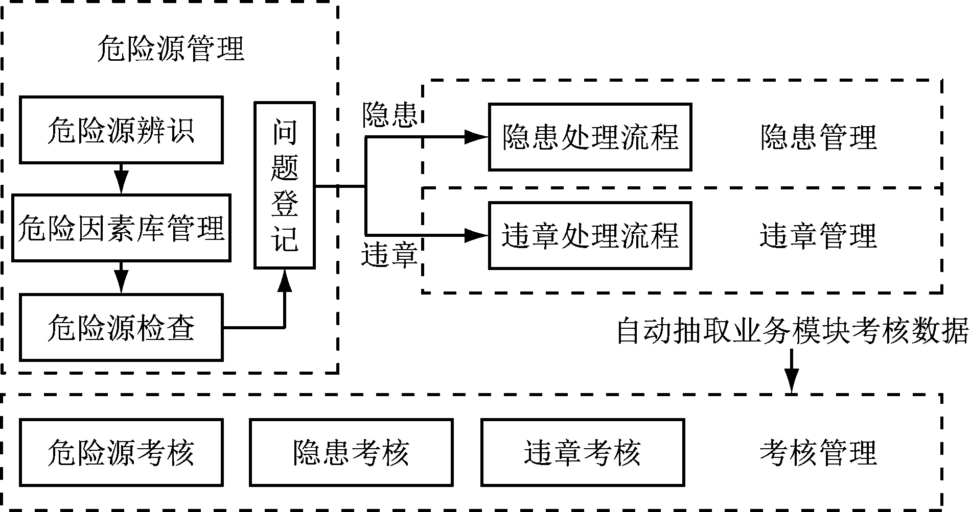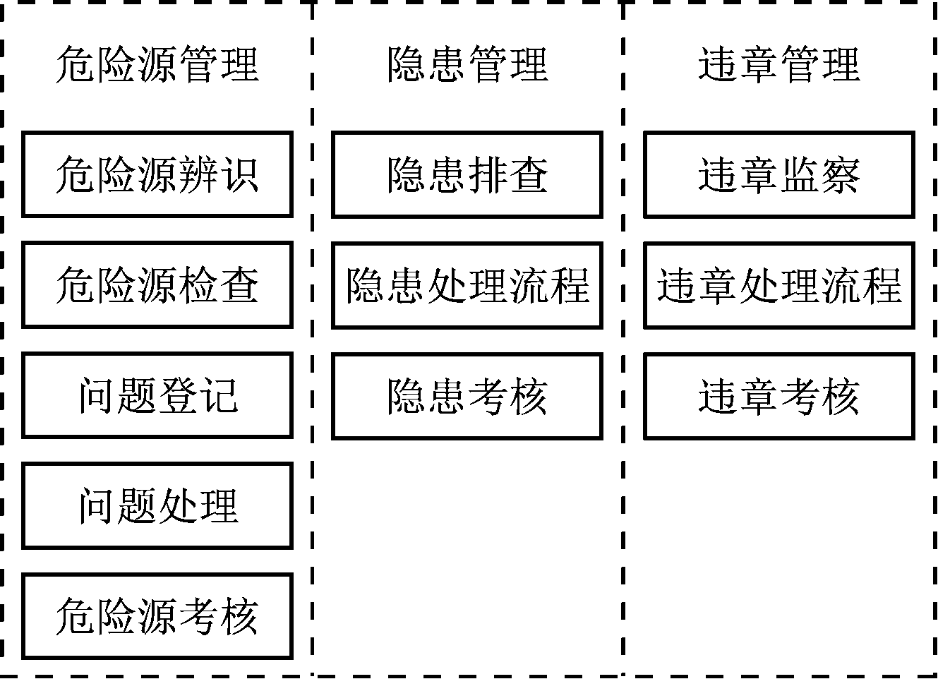 (3) 日常安全管理与危险源安全管理融合。以危险源管理、隐患管理、违章管理为例,原业务功能如图3所示。