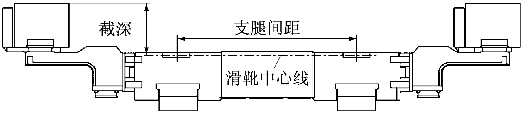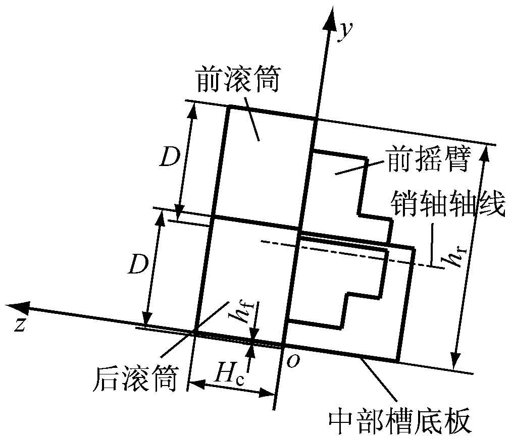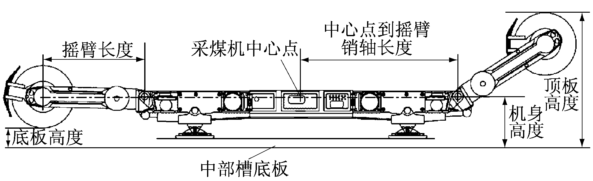 采煤机结构参数示意如图1所示。采煤机中心点为采煤机左右摇臂销轴之间的中点。