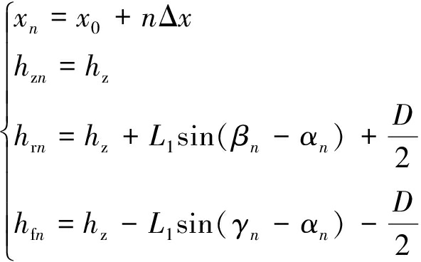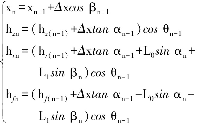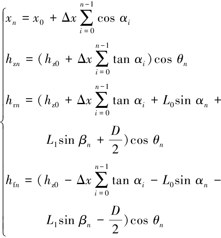 式中:n为当前采煤机所处区间编号,n=1,2,…,N;xn为当前采煤机水平位移;αi为采煤机处于区间i时的滚动角,i=0,1,…,n-1;hzn为当前采煤机高度;θn为当前俯仰角;hrn为当前顶板高度;hfn为当前底板高度;βn为当前前摇臂与x轴夹角。