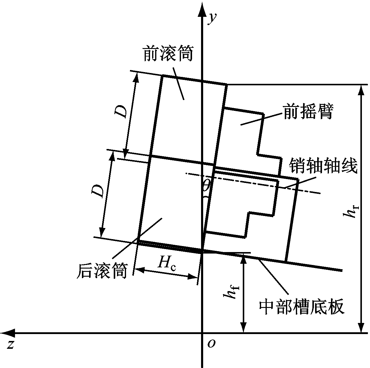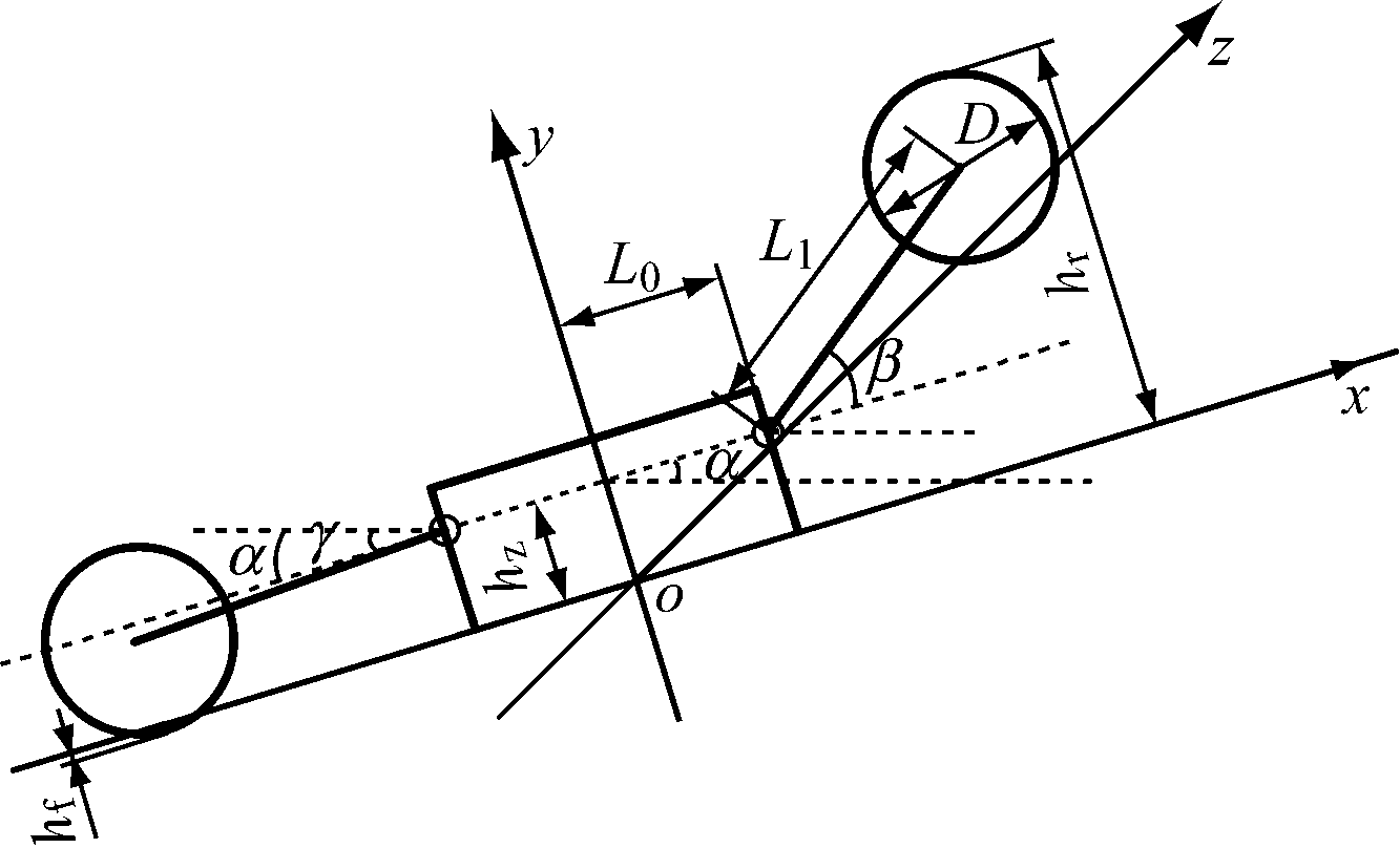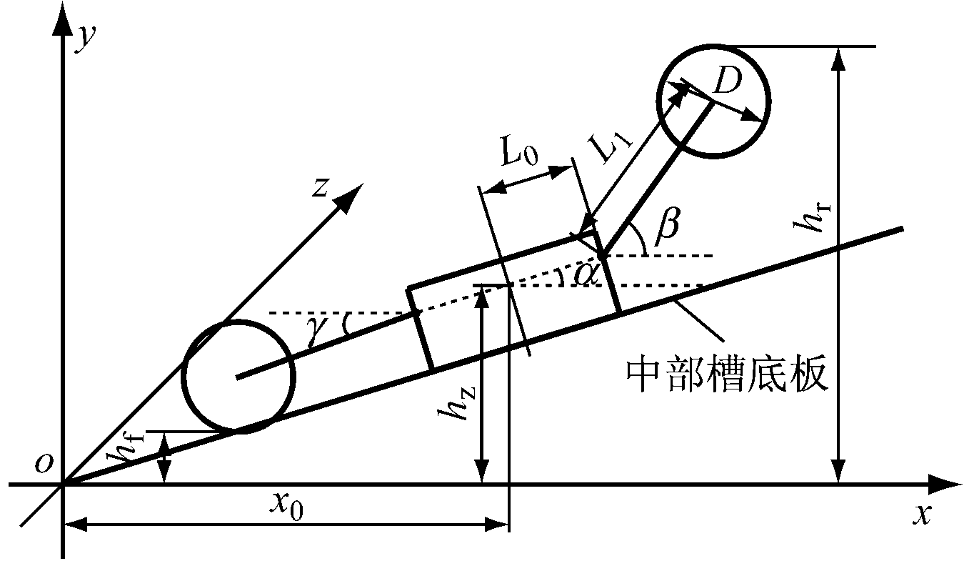定义采煤机位置为坐标系原点到采煤机中心点的距离。x0为采煤机在x轴的初始坐标,hz0为采煤机高度初始值(y轴初始坐标),hz为采煤机高度(在y轴的坐标),L0为采煤机中心点到摇臂销轴的距离,L1为摇臂长度,α为滚动角(采煤机机身与x轴夹角),β为前摇臂与x轴夹角,γ为后摇臂与x轴夹角,θ为俯仰角(采煤机机身与y轴夹角),D为滚筒直径,Hc为截深,hr为顶板高度,hf为底板高度。