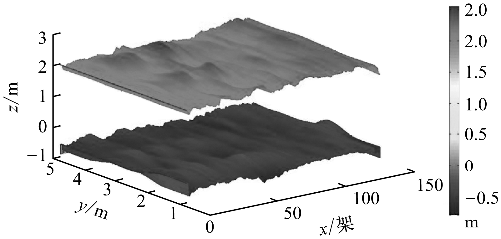 根据一个生产班连续6刀截割高度、下切深度绘制工作面顶底板三维图像,如图6所示,其中x轴以支架数表示位移量,更便于工程实施。可看出顶底板平整,工作面两侧巷道整齐,满足工程质量要求。