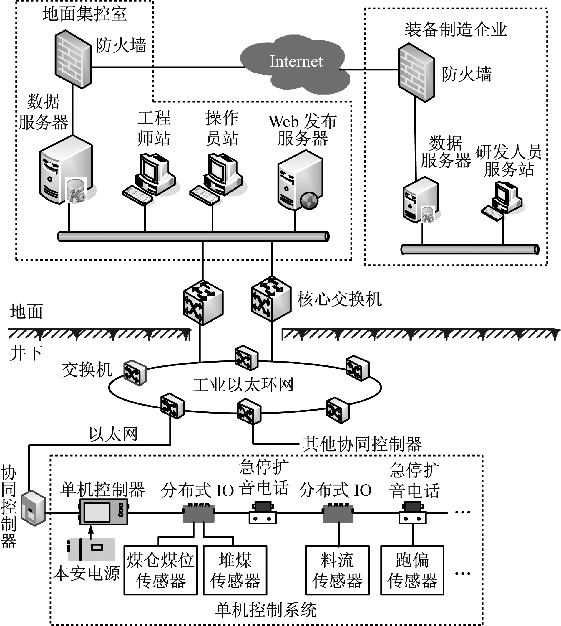 从功能上划分,主运煤流线协同控制系统包括单机控制系统和协同控制器2个部分。单机控制系统实现单台带式输送机或给煤机的智能保护和控制[3],协同控制器实现多台带式输送机协同运行。主运煤流线协同控制系统通过工业以太环网接入地面集控室,装备制造企业的数据服务器和研发人员服务站可通过Internet访问地面集控室的数据,如图1所示。单机控制系统基于CAN总线,协同控制器、单机控制器、分布式IO、急停扩音电话都是CAN总线的节点,跑偏传感器接入急停扩音电话,煤仓煤位传感器、堆煤传感器、烟雾传感器、滚筒温度传感器、料流传感器、速度传感器等通过分布式IO接入单机控制系统[4]。协同控制器通过CAN总线实现与单机控制系统的数据交互,多个协同控制器之间通过以太网实现数据交互。