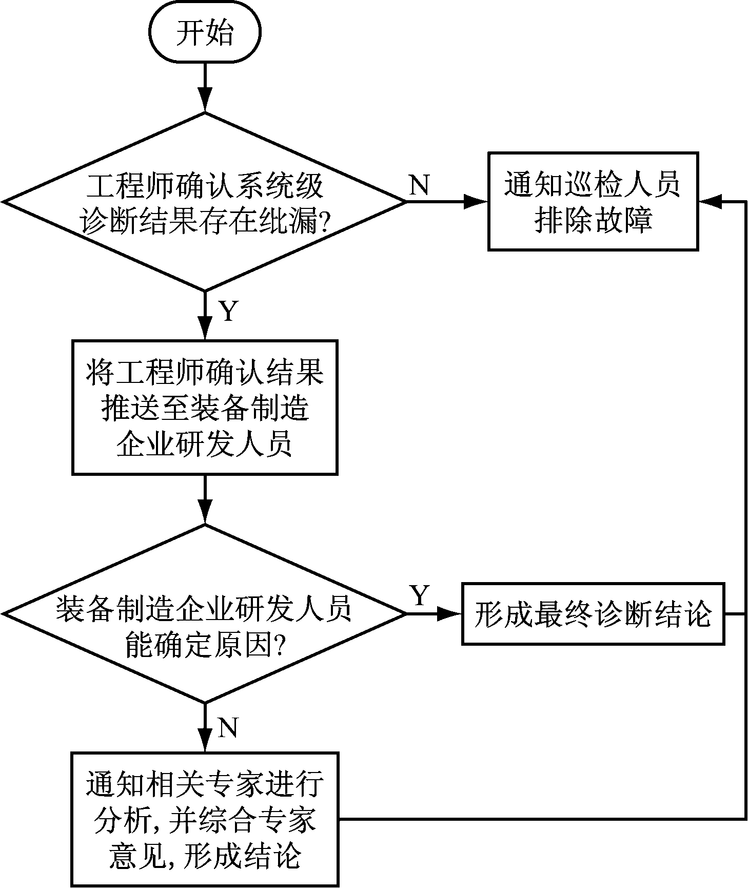 远程诊断是人参与的过程,由地面集控室的工程师和装备制造企业的研发人员完成。在系统级诊断中,协同控制器将故障分析结果推送到地面工程师站,经人工确认后,通知巡检人员排除故障。远程诊断流程如图3所示,其中人工确认是核心内容。