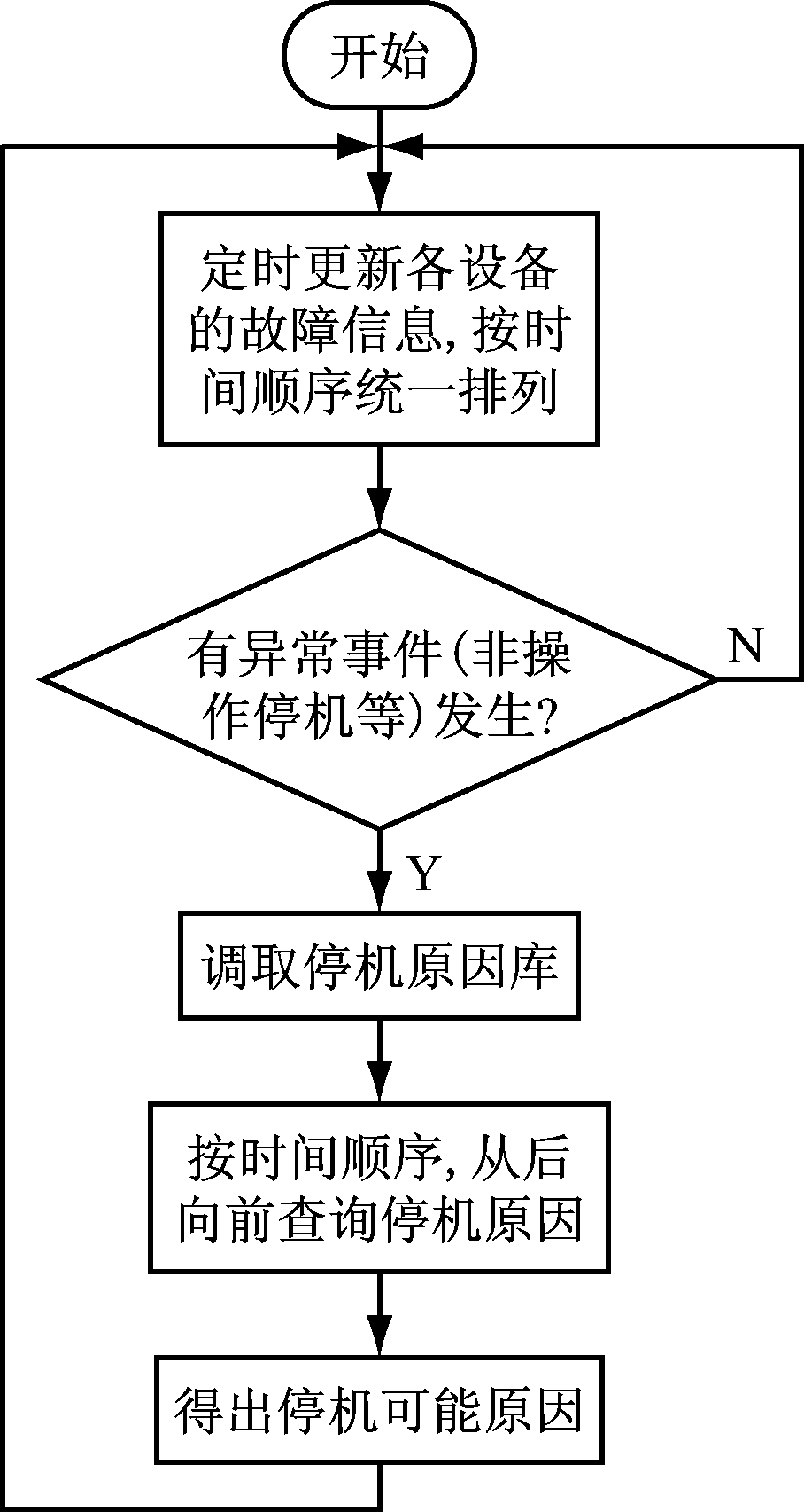 系统级故障诊断算法流程[10-11]如图2所示。协同控制器定时更新系统中各个设备的故障数据,并将所有数据按照时间先后统一排列。实时查询数据中异常事件(如非操作停机等),如有异常事件,则调取停机原因库查询停机原因。停机原因库由用户配置并存储在协同控制器中,其包含可能导致带式输送机、给煤机或整条主运煤流线停止运行的所有原因。按照时间顺序,从后向前查询故障数据是否出现在停机原因库中,将故障数据对应的所有停机原因认定为可能导致停机的原因,并对各种原因的可能性进行描述,发生时间越晚的可能性越大。