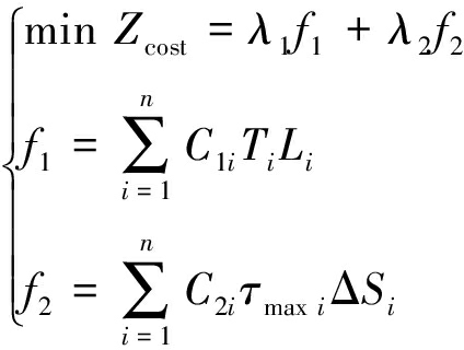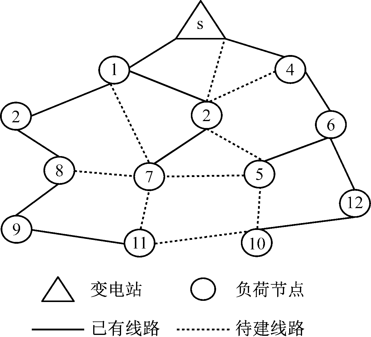 式中:Zcost为年规划费用;λi为投资回收率;f1为网络的年运行费用;f2为网损费用;n为架设线路总数;C1i=λi+αi,其中αi为设备折旧维修费用率;Ti为新建支路i的投资费用;Li为架设的线路,当支路i新建时取1,否则取0;C2i为单位电价;τmaxi为最大负荷利用小时数;ΔSi为支路有功损耗。