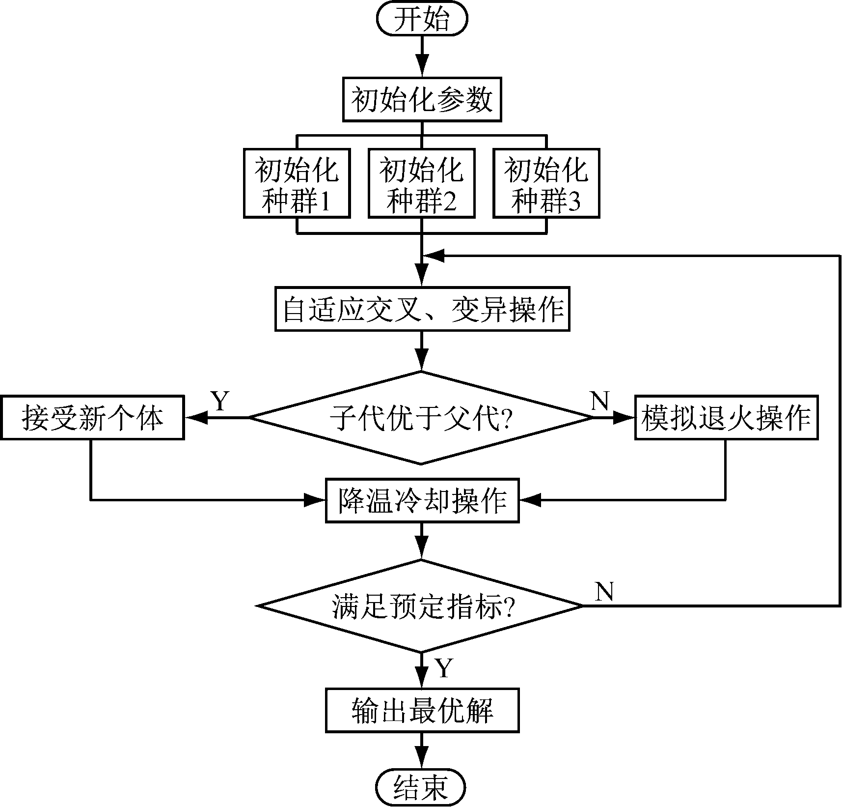 多种群模拟退火遗传算法以增加种群多样性为目的,其设计思想为初始化状态下种群足够丰富,或者算法在运行过程中依旧保持种群多样性[12]。首先在算法初始化状态下,选取适当的参数,例如交叉概率、变异概率、种群进化代数、初始温度值等,再加入多个独立的种群,分别让其独立进化,互不干扰,最大化保证种群独立的多样性。其次,因模拟退火算法具有渐进收敛性,全局搜索能力强,在算法运行过程中,可以接受当前不是最优解的概率存在,因而可以跳出局部最优情况[13]。所以,将二者的优良属性结合在一起,形成多种群模拟退火遗传算法,该算法全局搜索能力强,具有渐进收敛性。算法流程如图1所示。