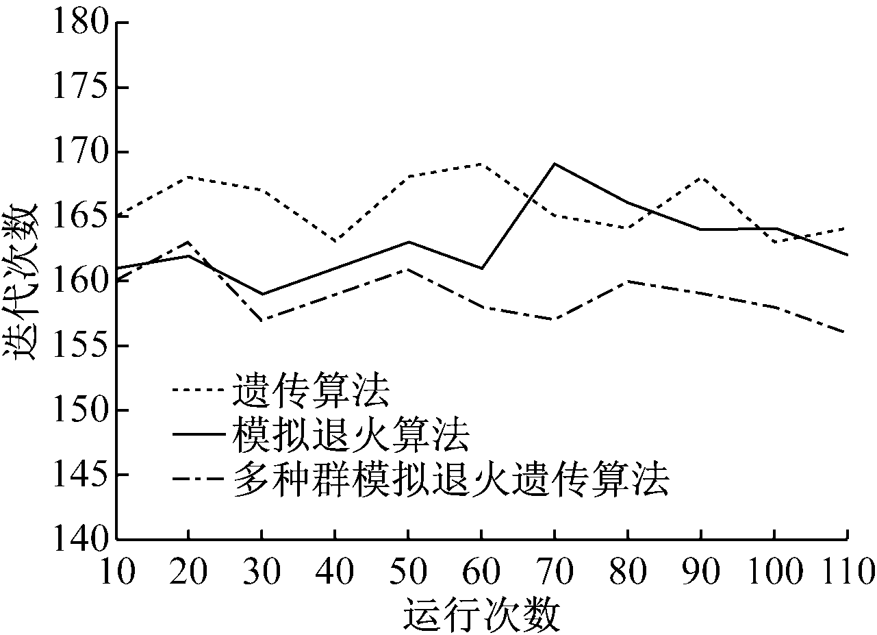 由图4可知,刚开始时,多种群模拟退火算法和模拟退火算法二者迭代次数几乎差不多,而遗传算法迭代次数偏多。但随着运行次数的增加,多种群模拟退火遗传算法展现出它的优势,优于其他2种算法。