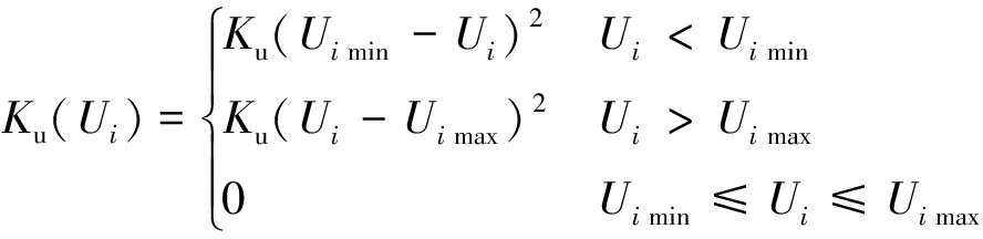 式中:Ku为节点电压惩罚因子,作为对偏离运行极限的惩罚;Ui为节点i的电压;Uimax,Uimin分别为Ui的上下限。