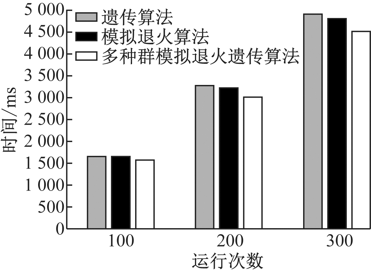 由图5可知,刚开始时,3种算法的运行时间几乎差不多,但随着运行次数的增加,可以看出,遗传算法和模拟退火算法二者运行时间基本上相同,而多种群模拟退火遗传算法运行时间渐渐减少。
