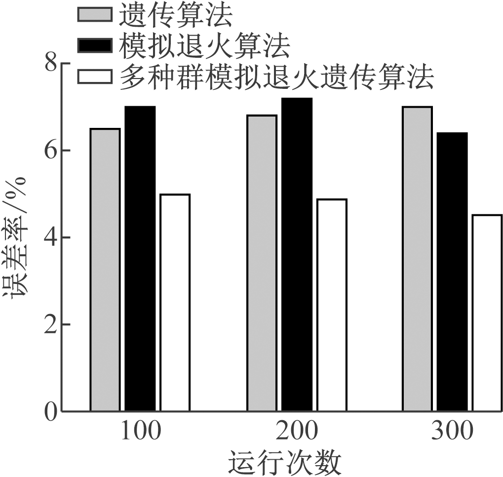 由图6可知,多种群模拟退火遗传算法在结合遗传算法和模拟退火算法的优点后,误差率有明显下降,运行次数在100次之后,稳定在5%左右,优于其他2种算法。