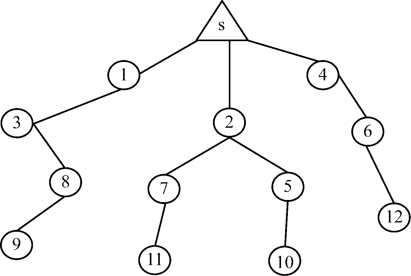 利用矿区内的配电网规划作为实验案例。实验配电系统由12个负荷节点和1个变电站构成,初始网络如图2所示,最优网络如图3所示。现有支路为10条,可以扩展的支路为9条,取年维护系数C1i=0.15,电价C2i=0.35,各负荷节点最大负荷利用小时数τmaxi=3 000。配电网节点容量见表1。利用多种群模拟退火遗传算法、标准遗传算法及模拟退火算法对配电系统进行优化,并对3种算法的优化结果进行对比分析。