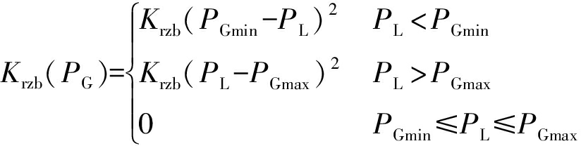式中:Krzb为变电站容载比惩罚因子;PG为变电站总负载容量;PGmax,PGmin分别为变电站总负载容量的上、下限;PL为当前变电站负载容量。