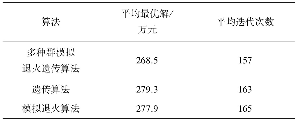 考虑到实际结果存在一定的误差和不确定性,因而进行了100次实验,去掉当中最差的10组解,计算出其余90组最优解的平均值。不同算法的年规划费用计算结果见表2。