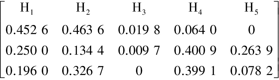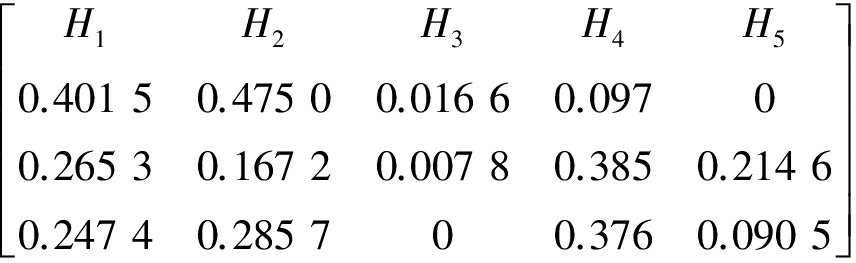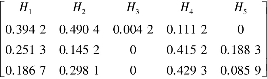 根据模糊综合评估模型的数学表达式,计算因素fi的模糊综合评估结果Wi(H),如式(14)所示。