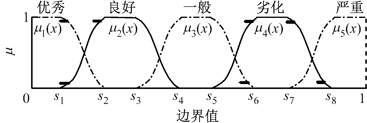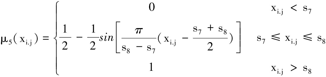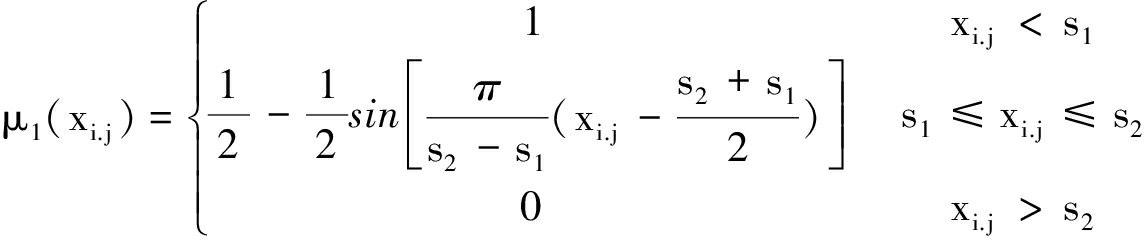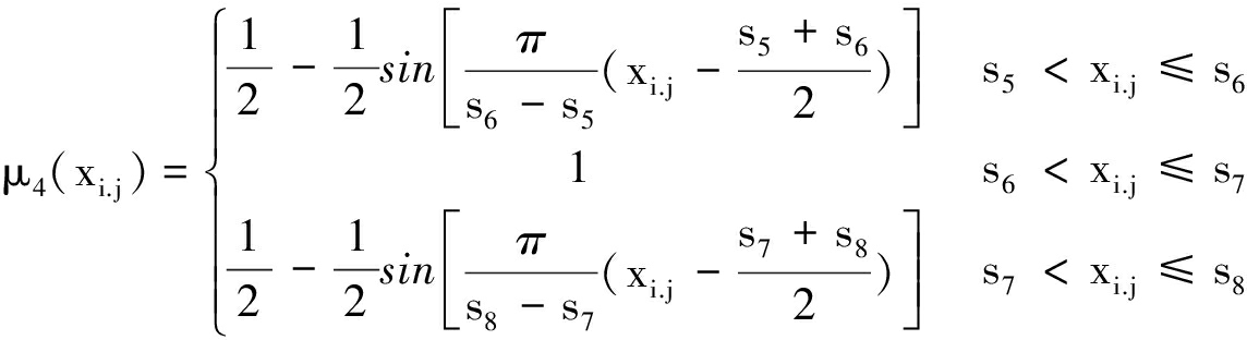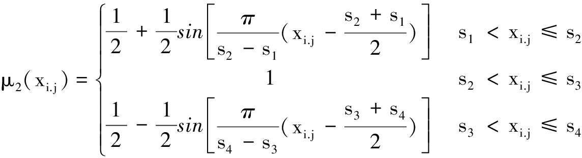 运用半梯形与半岭形相结合的隶属函数来表征模糊评估模型中的指标。隶属函数定义为