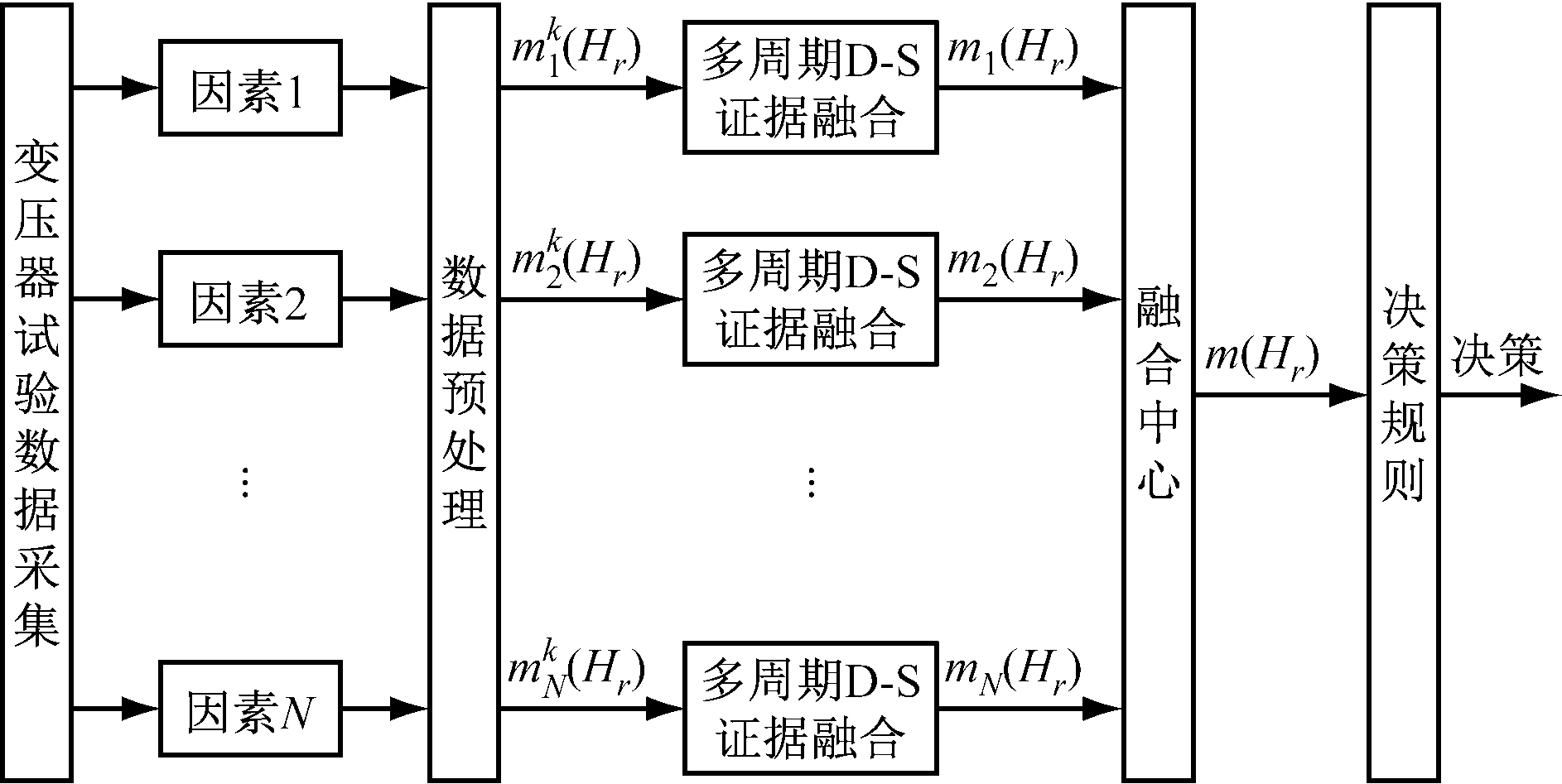 为第i个因素在k个试验周期经模糊评估模型所获得的对状态评估等级Hr的基本概率赋值,mi(Hr)为第i个因素在M个试验周期进行融合后对状态评估等级Hr的累积基本概率赋值,则信息融合计算步骤如下: