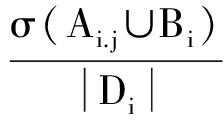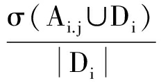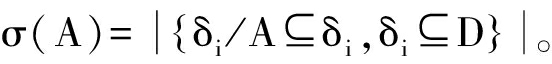 ;假定子集事务δi由mi个项xi.j组成,记为δi={xi.1,xi.2,…,xi.j,…,xi.mi}。σ(A)为项集A的支持度计数,即D中所包含某特定项集A的事务的个数,用统计概率学表示为![]()