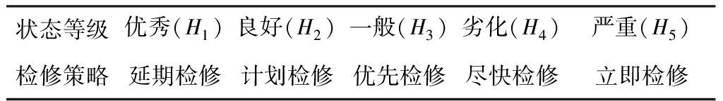 本文依据已有研究成果和《油浸式变压器(电抗器)状态评价导则》,按劣化程度将变压器运行状态划分为优秀、良好、一般、劣化和严重5个等级,各状态等级及其相应的检修策略见表1。