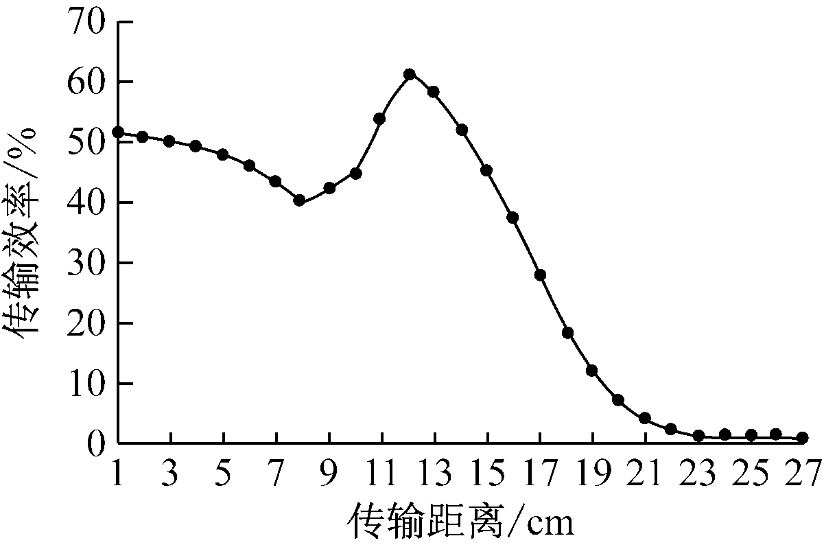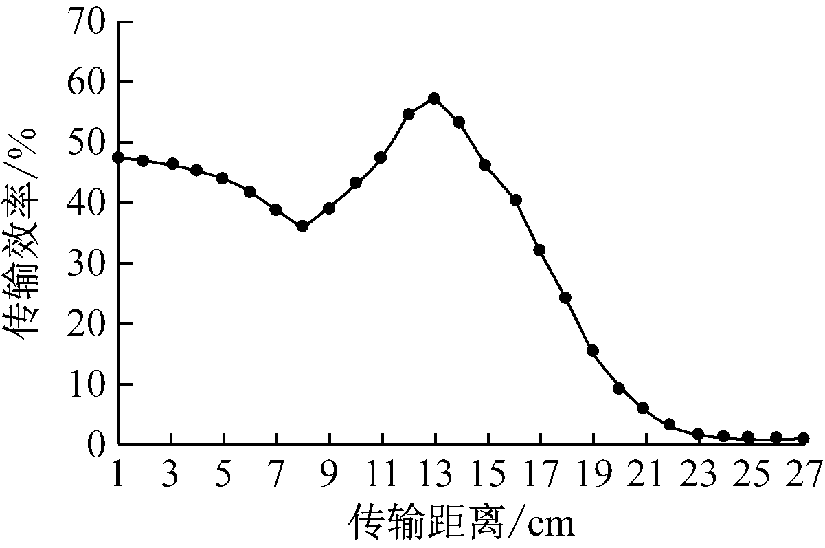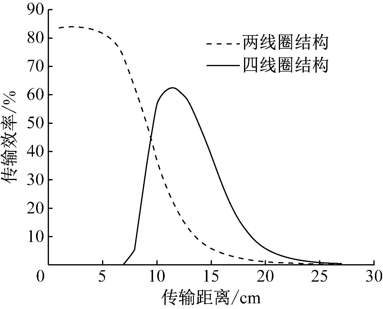 从图5可看出,两线圈结构谐振耦合单元传输效率随着传输距离的增大而逐渐减小:传输距离小于5 cm时,传输效率基本维持不变;传输距离在5~12 cm范围内,传输效率呈线性减小;传输距离大于12 cm时,传输效率缓慢减小。四线圈结构谐振耦合单元传输效率随着传输距离的增大先增后减:传输距离在6~11 cm范围内,传输效率呈线性增加;在传输距离为11 cm处存在最大传输效率;传输距离在11~18 cm范围内,传输效率呈线性减小;传输距离大于18 cm时,传输效率缓慢减小。传输距离小于线圈半径时,两线圈结构谐振耦合单元传输效率较高;传输距离大于线圈半径时,四线圈结构谐振耦合单元传输效率较高。因此,传输距离小于线圈半径时,变线圈结构谐振耦合单元采用两线圈结构;传输距离大于线圈半径时,变线圈结构谐振耦合单元采用四线圈结构。