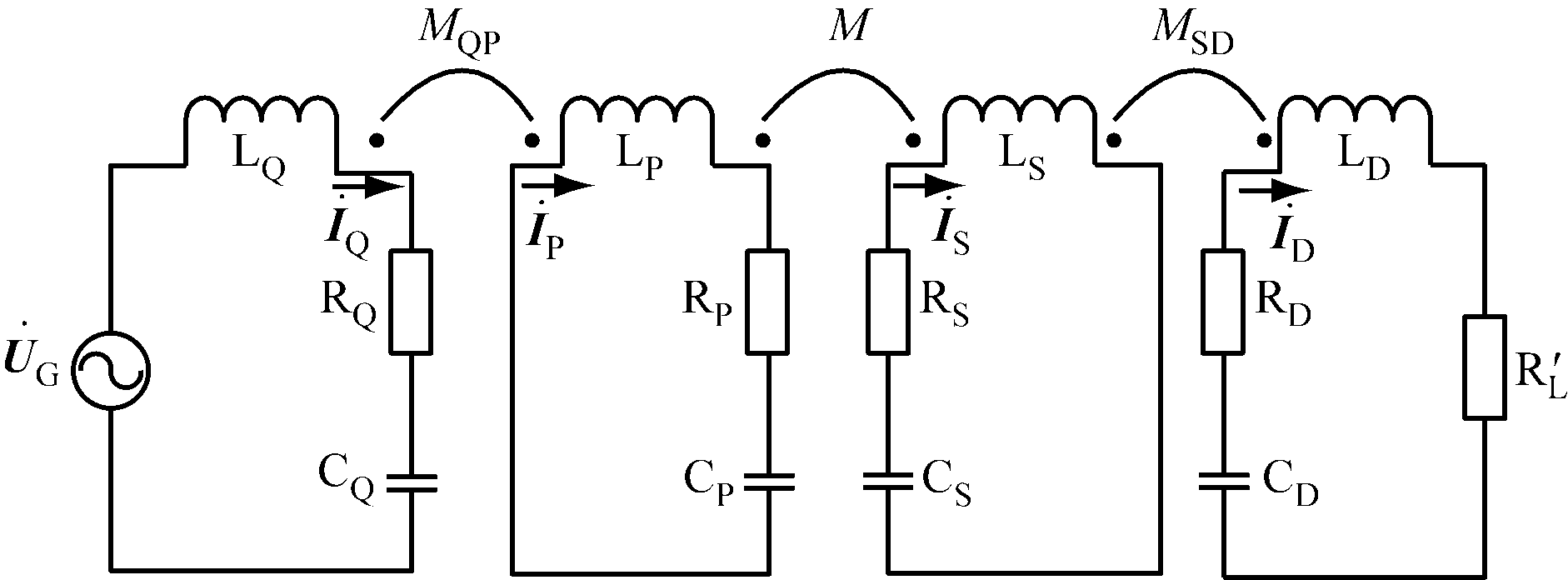 四线圈结构谐振耦合单元由驱动谐振回路、发射谐振回路、接收谐振回路和负载谐振回路组成[14-15],如图4所示。LQ,LD分别为驱动线圈和负载线圈的自感;RQ,RD分别为驱动线圈和负载线圈的寄生电阻;CQ,CD分别为驱动线圈和负载线圈的谐振补偿电容;MQP,MSD分别为驱动线圈和发射线圈、接收线圈和负载线圈之间互感。为简化分析,忽略线圈之间的交叉耦合,仅考虑相邻线圈之间的直接耦合作用。