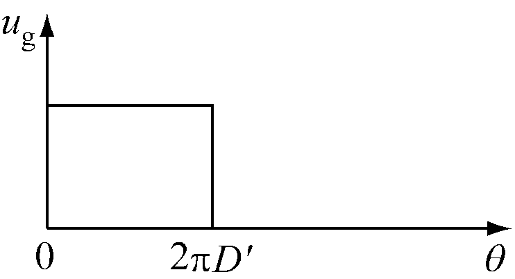 E类逆变器基本电路拓扑如图6所示。UCC为直流电源;L′,C′分别为谐振电感、电容;R″L为负载。扼流电感L阻抗足够大,使流过的电流为恒定值。并联电容C为外加电容,目的是使开关管S满足如图7所示的开关状态[16-18]。ug为开关管S驱动信号;iS,uS分别为开关管S漏源极电流、电压;D′为开关管S占空比;θ为电角度。