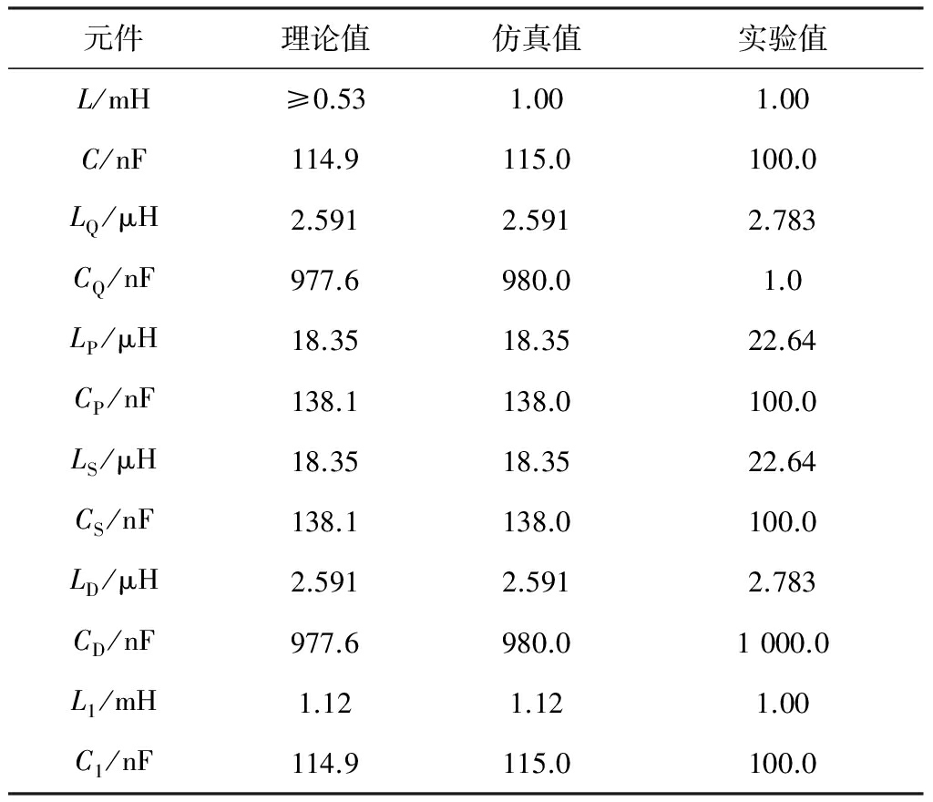 根据变线圈结构的磁耦合谐振式无线电能传输系统电路分析中给出的电路元件计算方法及线圈参数,计算得到各电路元件的理论值,再根据元件实际情况设置仿真值,同时采用阻抗测试仪LCR-821测量实验中各线圈的电感,并根据电路谐振频率计算各线圈串联电容,具体参数见表1。