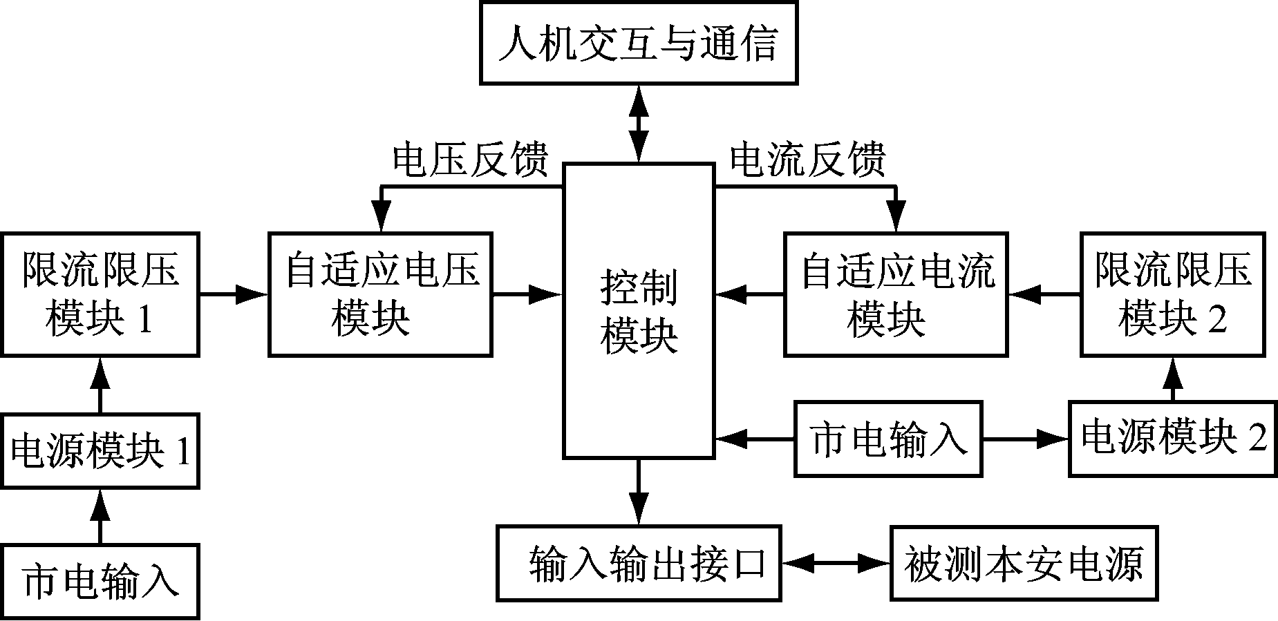 多重保护本安电源测试装置的硬件主要包括电源模块、自适应电压模块、自适应电流模块、控制模块、限流限压模块等,如图1所示。