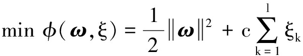 令输入样本为xk,k=1,2,…,l(l为样本个数);输出为yk,yk∈{+1,-1},“+1”和“-1”分别表示有人进入和无人进入2种状态。设超平面方程为f(x)=ωTx+b,x=[x1 x2…xk],ω,b分别为超平面方程的斜率和截距。引入松弛变量ξk和惩罚因子c,可得优化问题: