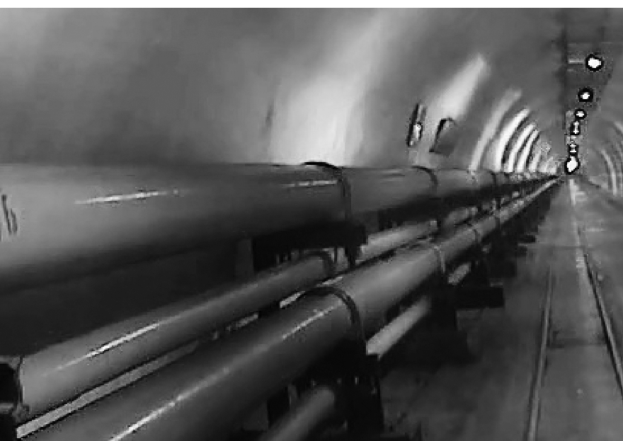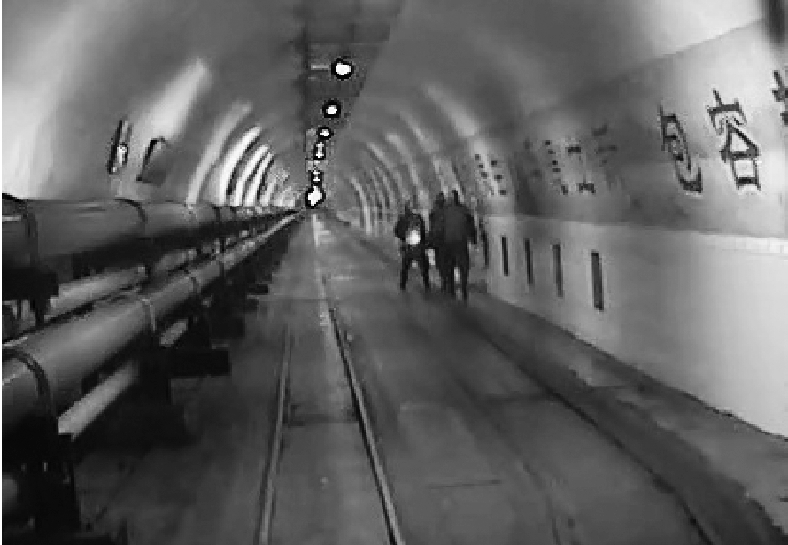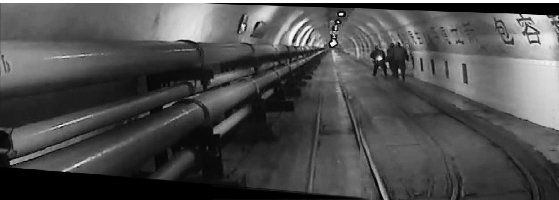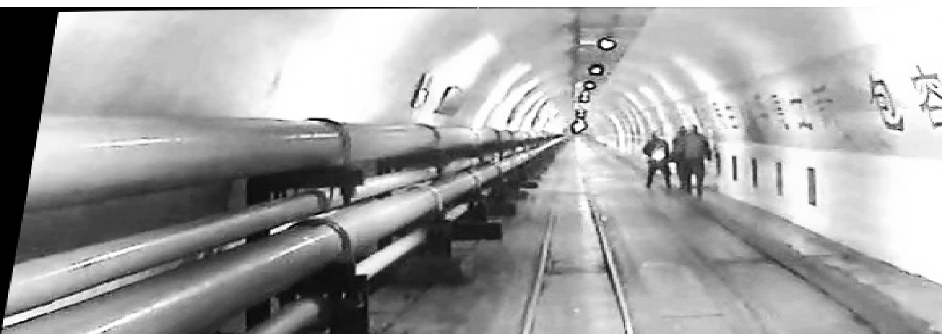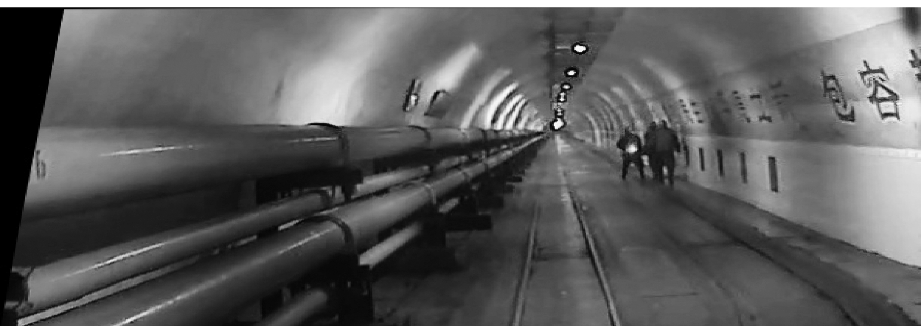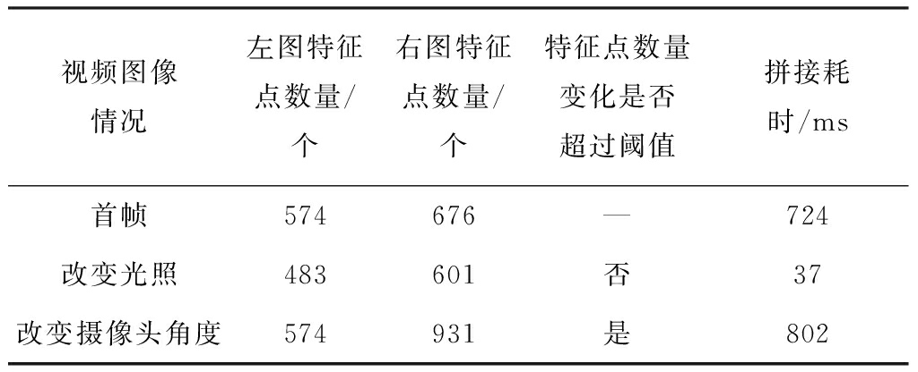 设定特征点数量变化阈值为200。由表2可看出,首帧图像拼接耗时较长;在改变光照情况下,提取的特征点数量变化未超过阈值,仍采用之前的投影变换矩阵进行拼接,运行速度较快;在改变1个摄像头角度情况下,右图中特征点数量变化超过阈值,需重新进行特征点配准、提纯,以及投影变换矩阵计算、图像融合处理,导致耗时增加,但整体上仍可满足视频拼接的实时性需求。从图6可看出,基于改进SURF的井下视频拼接算法具有较好的视频拼接效果。