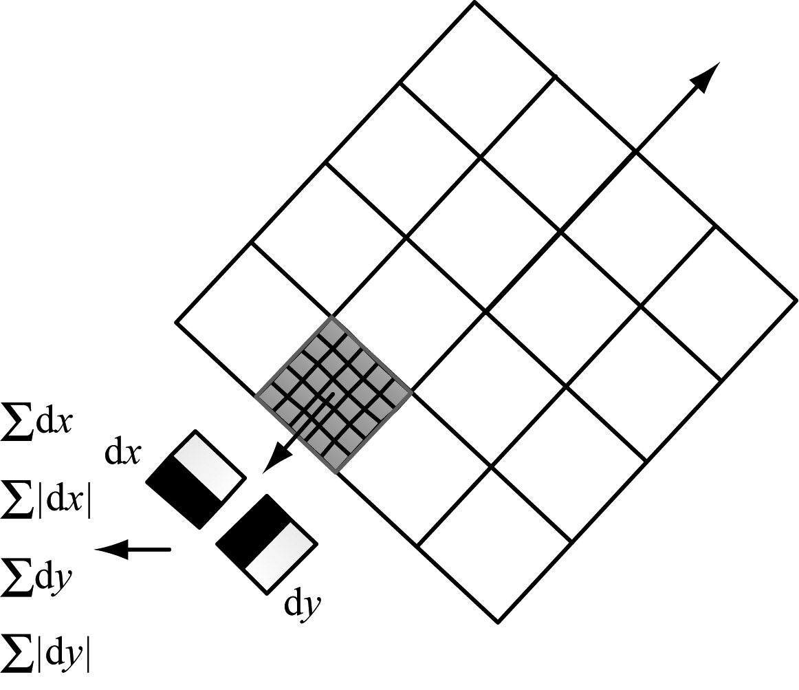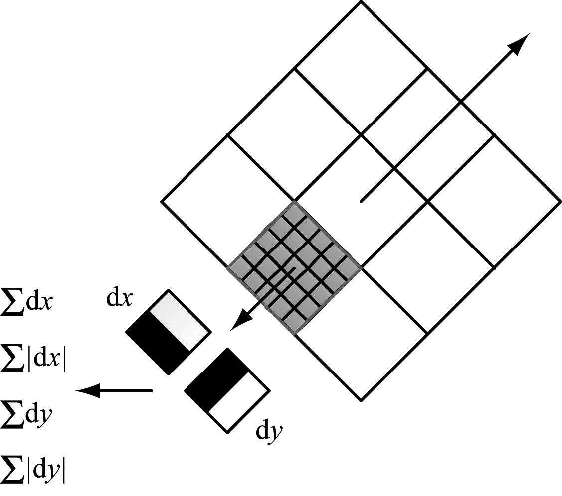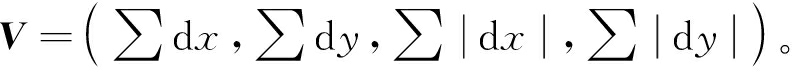 (5) 生成特征点描述符。构建一个以特征点为中心、边长为20s的正方形邻域,同时为保持旋转不变性,将正方形邻域方向调整为与特征点方向一致,如图2所示。然后将正方形邻域划分为4×4=16个子区域,分别计算每个子区域中采样像素的Harr小波响应,并统计其水平方向dx、垂直方向dy、水平方向绝对值|dx|、垂直方向绝对值dy之和,得到一个4维特征向量