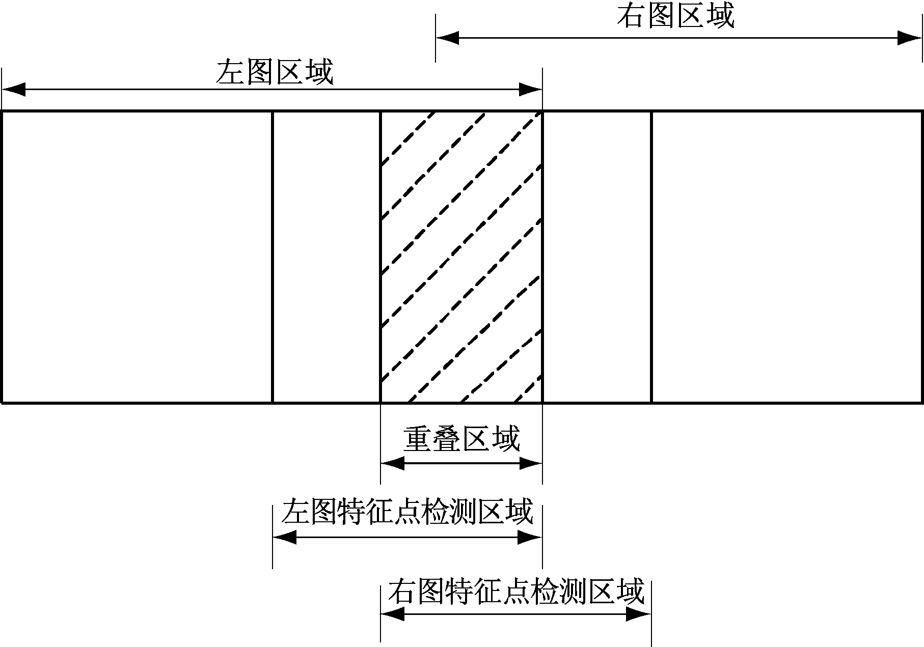 (2) 仅在ROI提取特征点。实际拼接实验中,待拼接的2幅图像应存在30%~50%的重叠区域[16]。可知在特征点配准阶段,仅重叠区域内的配准为正确匹配,重叠区域外的配准为误匹配。传统的拼接算法往往对待拼接图像的全部区域分别进行特征点提取和配准,不仅增加了运算成本,而且当左摄像头采集图像(左图)左侧与右摄像头采集图像(右图)右侧存在纹理相近的区域时,极易造成误匹配。本文采用设定ROI的方法来解决上述问题[17],即将左图的右50%区域设定为ROI,将右图的左50%区域设定为ROI,具体可通过OpenCV中的ROI函数实现。设定ROI如图4所示。特征点提取和配准操作只在ROI内进行。