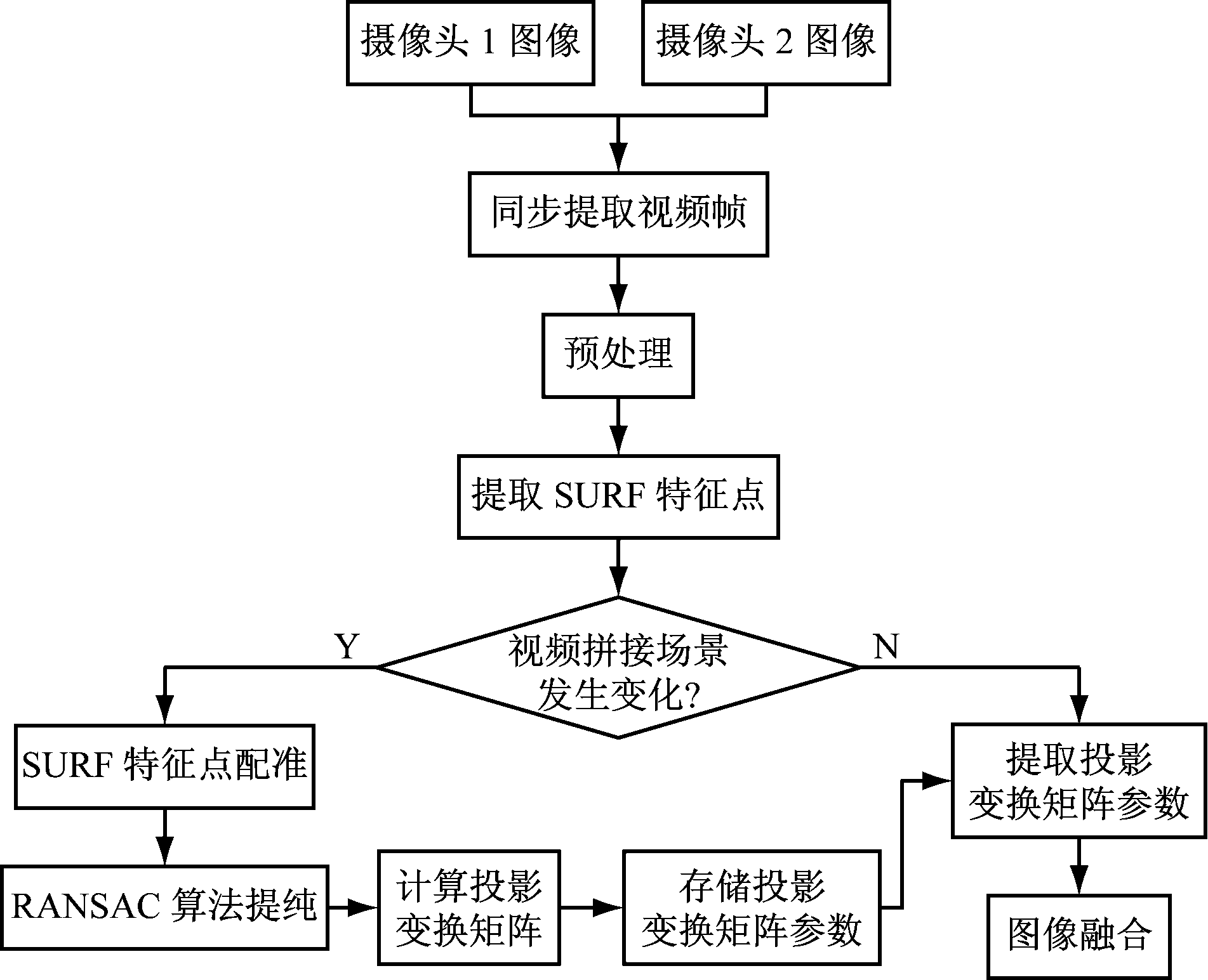 视频拼接技术的关键与核心是图像配准[5],其实质是对不同采集条件下获取的具有一定重叠区域的图像进行匹配,以寻求2幅图像之间的几何变换关系,继而将待拼接图像投影变换到目标图像坐标系下,最终实现重叠区域对齐[6]。目前主流的配准方法是基于特征的配准方法。D. G. Lowe[7]提出了尺度不变特征转换(Scale-Invariant Feature Transform,SIFT)算法用于图像配准。该算法对图像旋转、尺度缩放、亮度变化具有良好的不变性,但计算量过于庞大,因此运行速度较低,无法满足视频拼接的实时性要求[8]。H. Bay等[9]在SIFT算法基础上,提出了加速鲁棒特征(Speeded Up Robust Features,SURF)算法。该算法较SIFT算法运行快速,抗变换性能更加稳定,且生成的描述符具有良好的可区分性[10],但应用于实时性要求较高的视频拼接时,其性能仍需改进[11]。