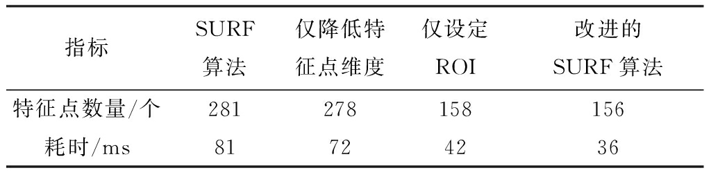 从表1可看出,仅降低特征点维度时,提取的特征点数量与SURF算法相比基本保持不变,但特征点提取时间明显缩短;仅设定ROI时,提取的特征点数量减少,提取速度大幅提升;改进的SURF算
