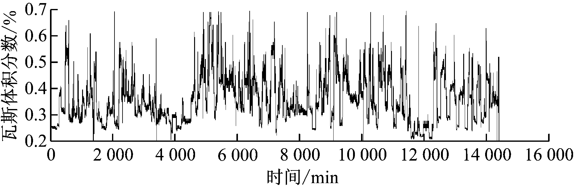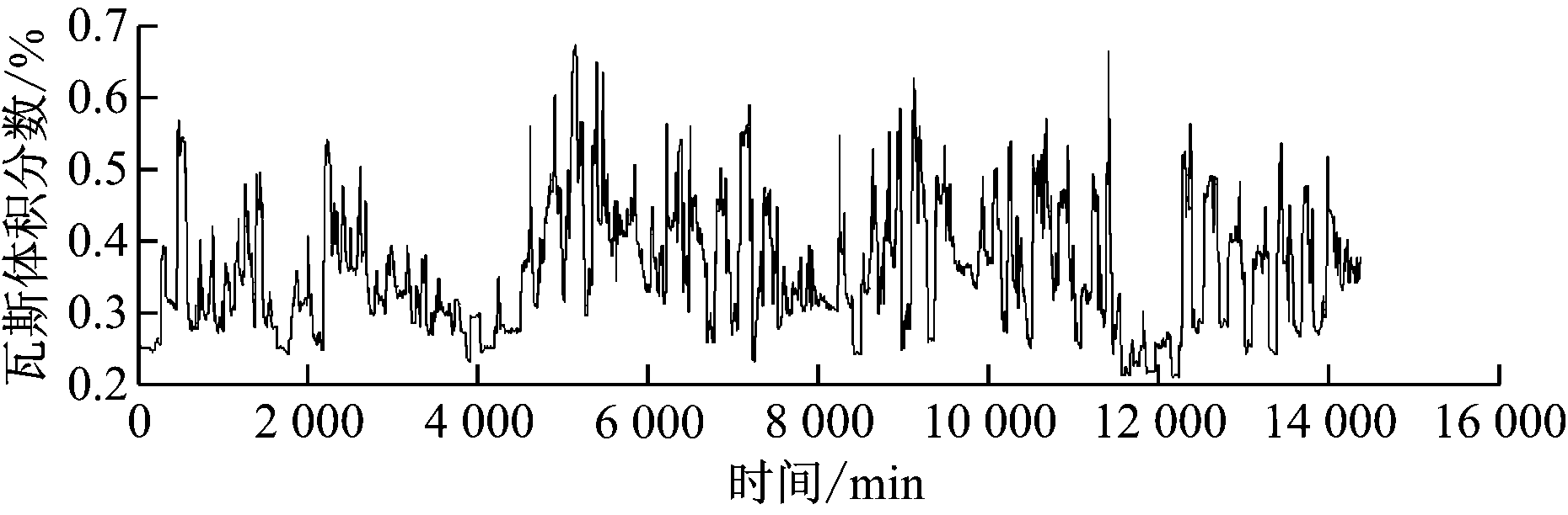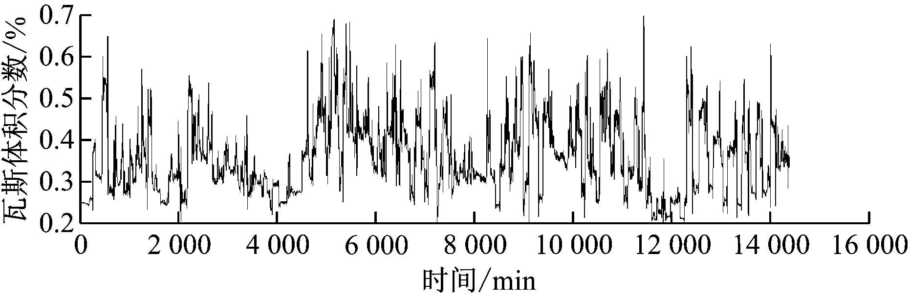 采集陕西某煤矿回采工作面上隅角10 d的瓦斯监测数据,该煤矿安全监测监控系统监测周期为30 s,由于实际获取的监测数据时间间隔不均匀,以每1 min重采样,构成原始瓦斯监测数据序列,如图1所示。瓦斯监测数据序列长度为14 400;瓦斯体积分数最大值为0.694%,最小值为0.200%,平均值为0.362%。
