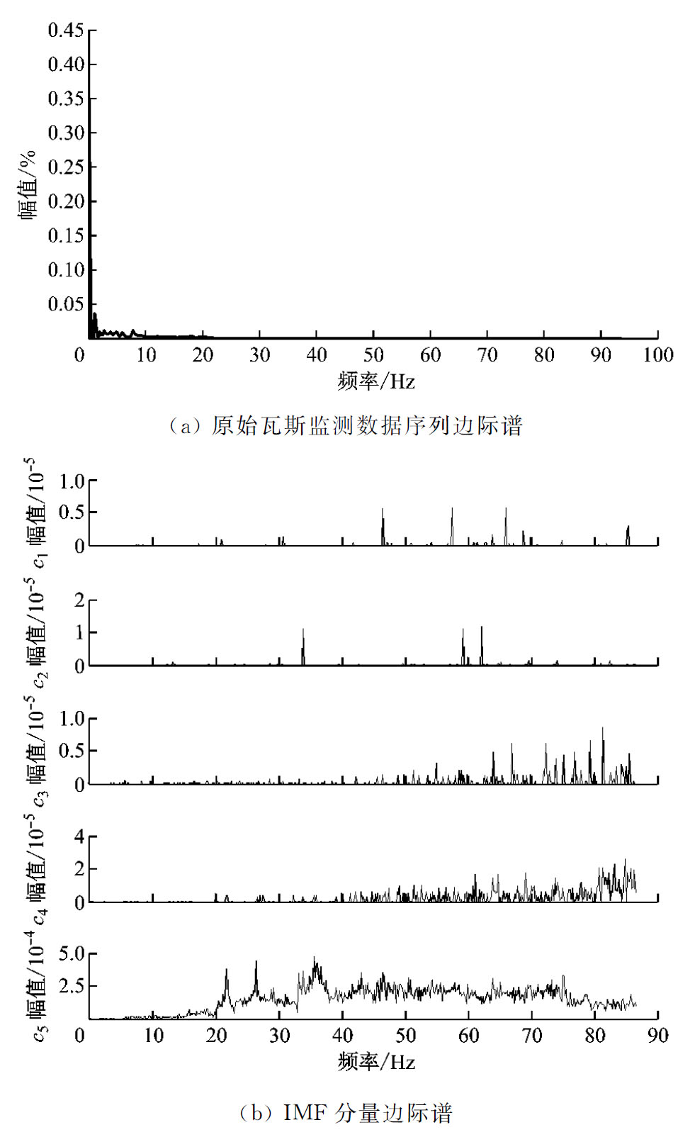(2) 瓦斯监测数据HHT谱分析。对每个IMF分量进行Hilbert变换,计算得到原始瓦斯监测数据序列的边际谱,从边际谱所呈现的幅频关系中,确定边际谱中能量集中的频率区间[H1,H2],作为原始瓦斯监测数据序列的有效频率分布范围。同样地,对每个IMF分量进行EMD处理和Hilbert变换,得到每个IMF分量的边际谱。