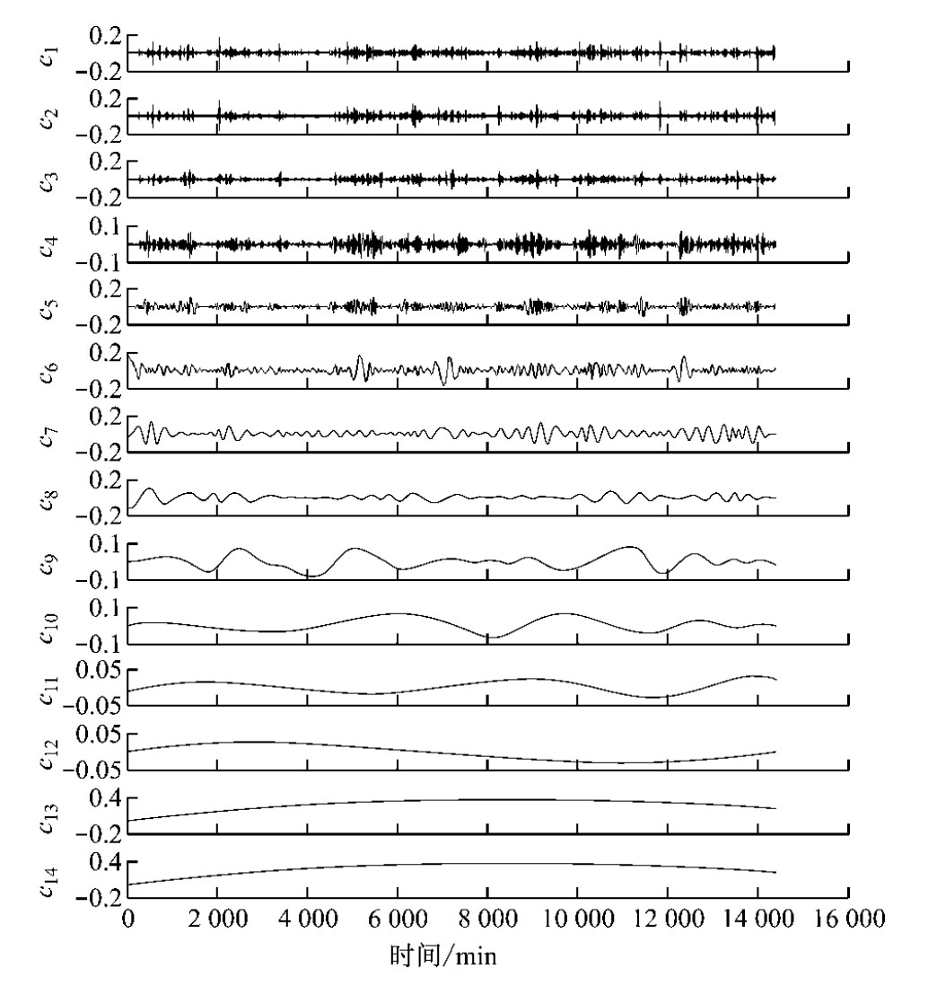 采用式(1)对原始瓦斯监测数据序列进行EMD处理,得到14个IMF分量,如图2所示,其中c14为余项,代表瓦斯监测数据序列的平均趋势。从图2可看出,前5个IMF分量c1—c5表现出高频特征,可能包含噪声信号。采用式(2)—式(5)进行Hilbert变换,得到原始瓦斯监测数据序列及c1—c5的边际谱,如图3所示。