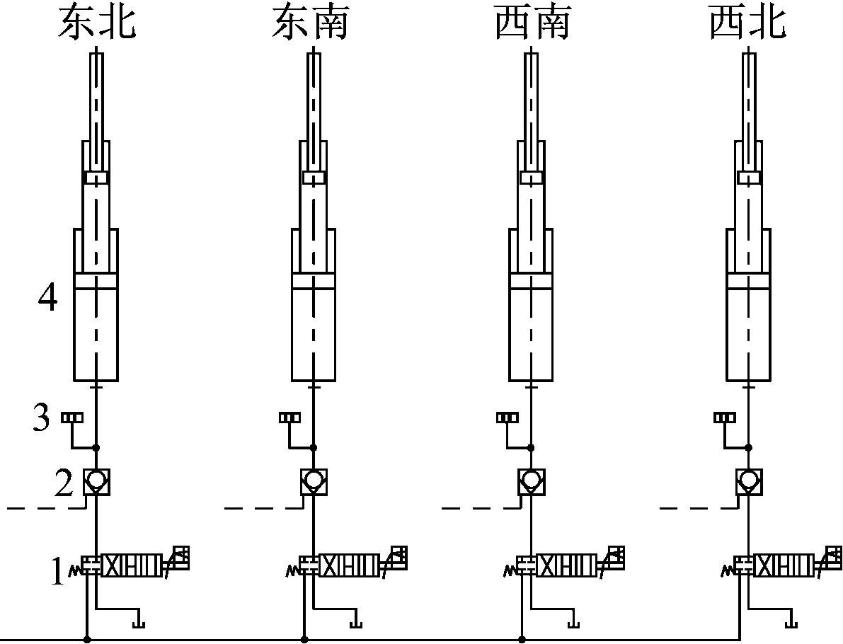 1-比例方向阀;2-液控单向阀; 3-压力传感器;4-双伸缩活塞式油缸