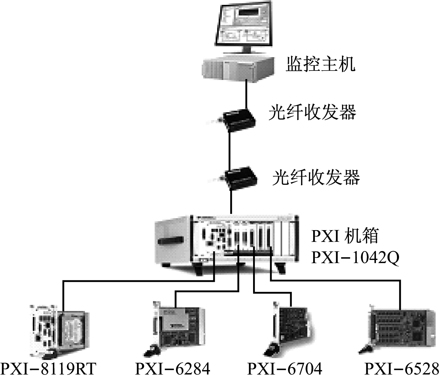 通过LabVIEW Real-Time模块及RT系列硬件,保证数据采集和四缸同步控制系统可靠确定的实时性能。下位机设计应用PXI平台,PXI-8119RT为嵌入式实时控制器,配备机箱为7槽3U PXI机箱PXI-1042Q,模拟量采集卡为18 bit分辨率PXI-6284,主要应用于位移、压力、温度、液位信号采集。为降低采集误差,信号输入采用差分输入并在SCB-68A接线板上焊接了差分低通滤波模块。模拟量信号输出采用16 bit分辨率PXI-6704,控制比例方向阀及比例溢流阀开口,数字量输入输出采用24路通道间光隔离PXI-6528板卡,实现对接近开关信号输入采集及控制阀组信号输出。嵌入式实时控制器通过网口将数据通过光纤收发器转接至光纤盒,通过光纤发送至控制室内,控制室内光纤收发器通过网线将数据转发到对应的监控主机,最终实现对液压支架试验台远程实时控制。系统硬件结构如图2所示。