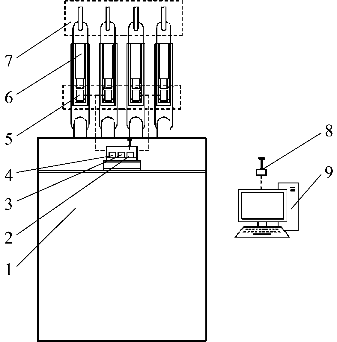 1-箕斗;2-串口无线发送器;3-模拟量采集卡;4-变送器; 5-拉压力传感器;6-张力平衡装置;7-提升钢丝绳; 8-串口无线接收器;9-主控上位机