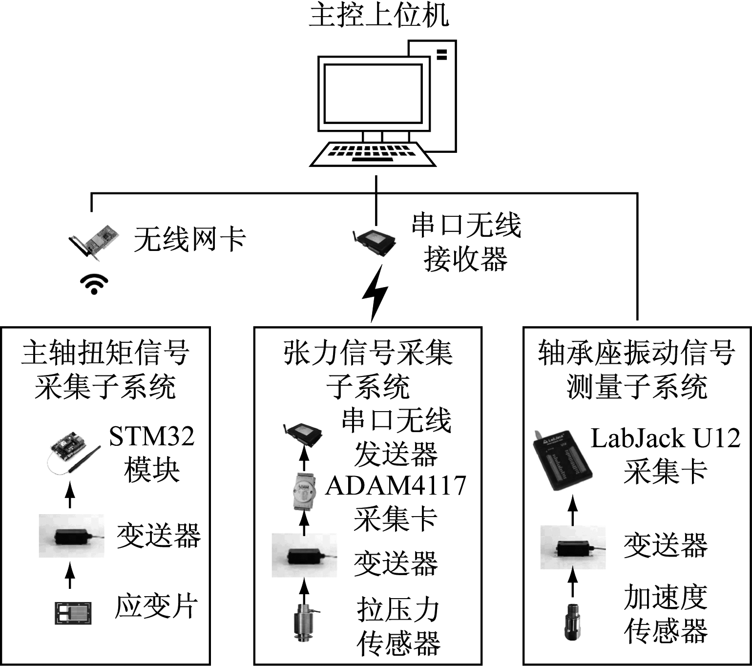 测量主轴扭矩时,首先利用胶带将电阻应变片均匀布置在转轴上,按全桥方式与采集模块连线。测量时,由于主轴扭矩变化,应变片的电阻值也发生变化,导致桥路两端形成电压差;变送器将电压差放大并传输给采集板卡,并通过无线子模块发射,由无线网卡接收并传送至主控上位机软件;主控上位机软件经过换算,显示并存储实时采集的主轴扭矩信号。该子系统使用STM32板卡进行数据采集,功耗小、成本低,且能达到较高的采样频率;使用USR-WIFI232无线子模块进行通信,无需编写协议;使用WiFi无线通信方式,灵活稳定。