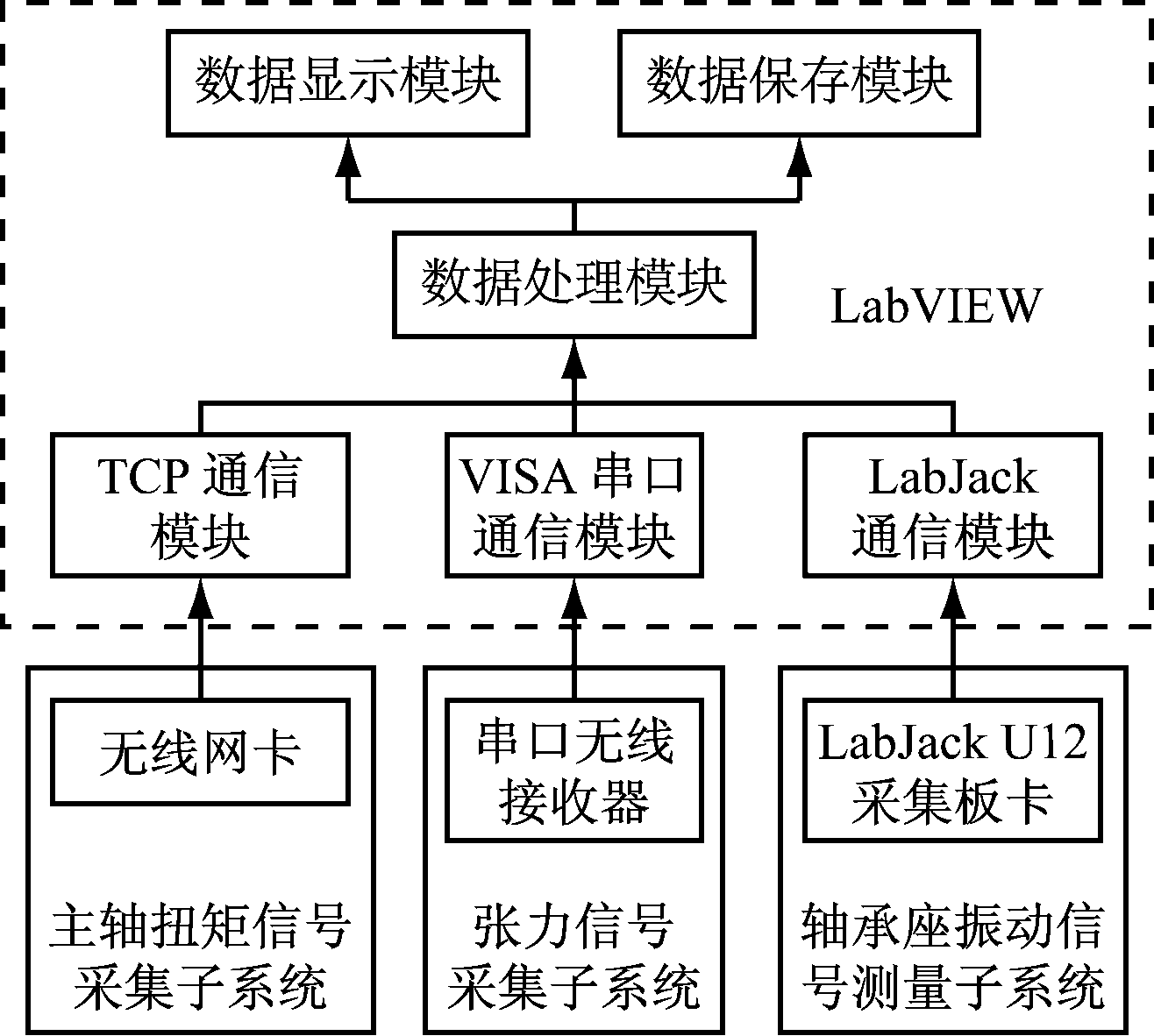 系统软件结构如图6所示。针对主轴扭矩信号采集子系统的WiFi通信方式,可使用系统集成的“TCP Open Connection”、“TCP Write”、“TCP Read”和“TCP Close Connection”等函数实现上位机与STM32之间的无线网络通信;针对张力信号采集子系统的串口通信方式,可使用系统集成的“VISA Configure Serial Port”、“VISA Read”和“VISA Close”等函数实现上位机与无线串口接收器之间的数据通信;针对轴承座振动信号测量子系统的USB连接,可安装LabJack U12采集卡自带的驱动程序,使用“AIstream Start”、“AIstream Read”、“AIstream Close”等函数实现上位机与LabJack U12采集卡之间的数据通信。