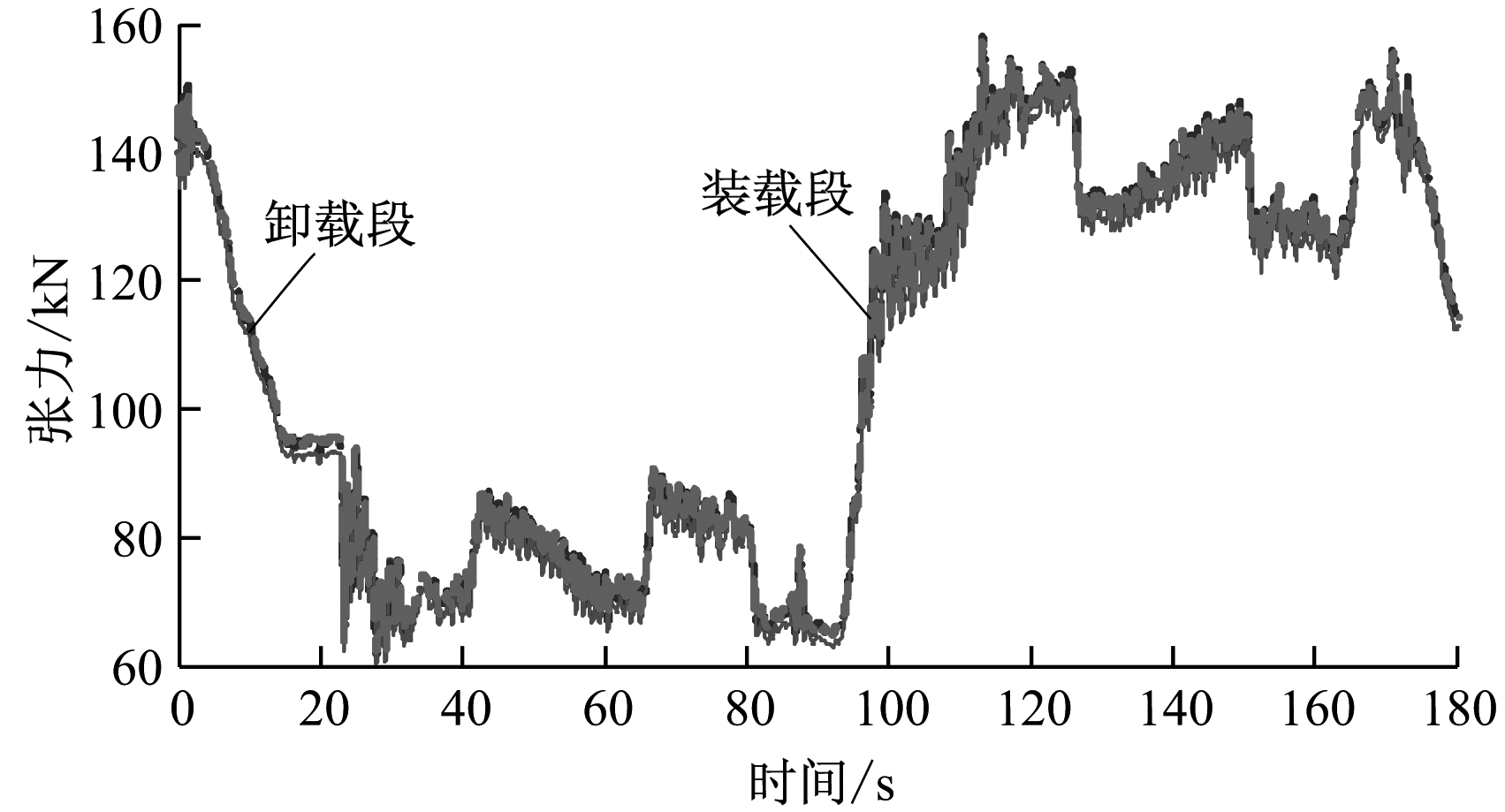 张力信号采集子系统主要包括拉压力传感器、变送器、模拟量采集卡、串口无线收发器等, 如图3所示。其中,拉压力传感器选用ZSF-A传感器,其额定载荷可根据实际工况配置,灵敏度为2±0.002 mV/V;采集板卡选用ADAM4117模拟量采集卡,其含有8路可独立配置的差分通道;串口无线收发器选用S02收发器,最大视距传输距离可达2 000 m。